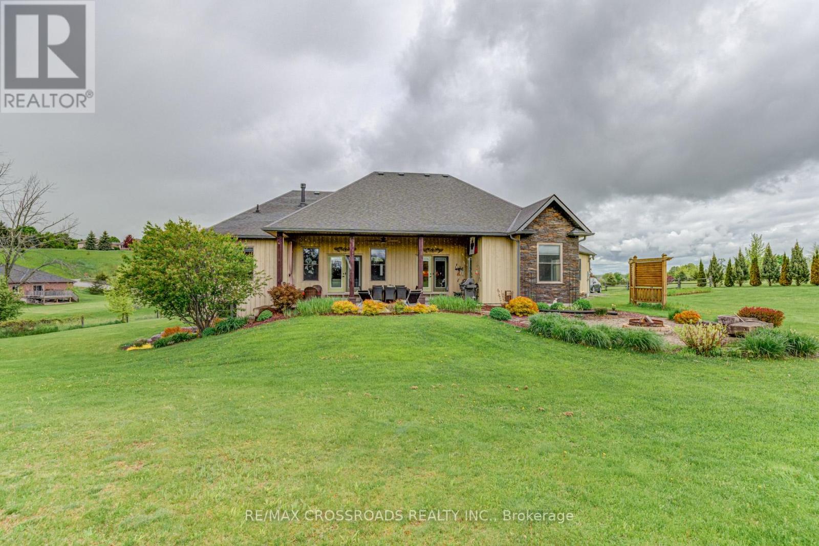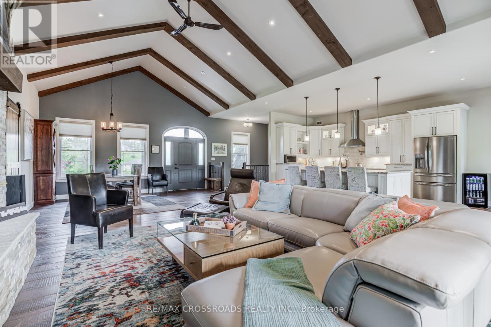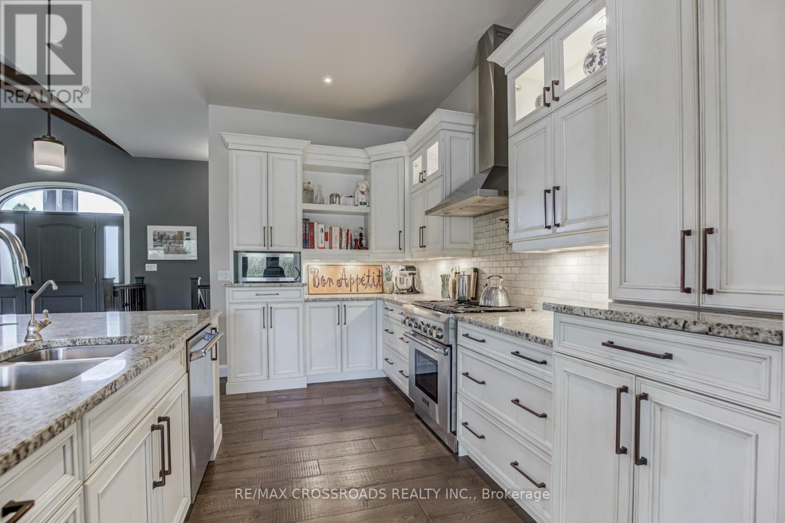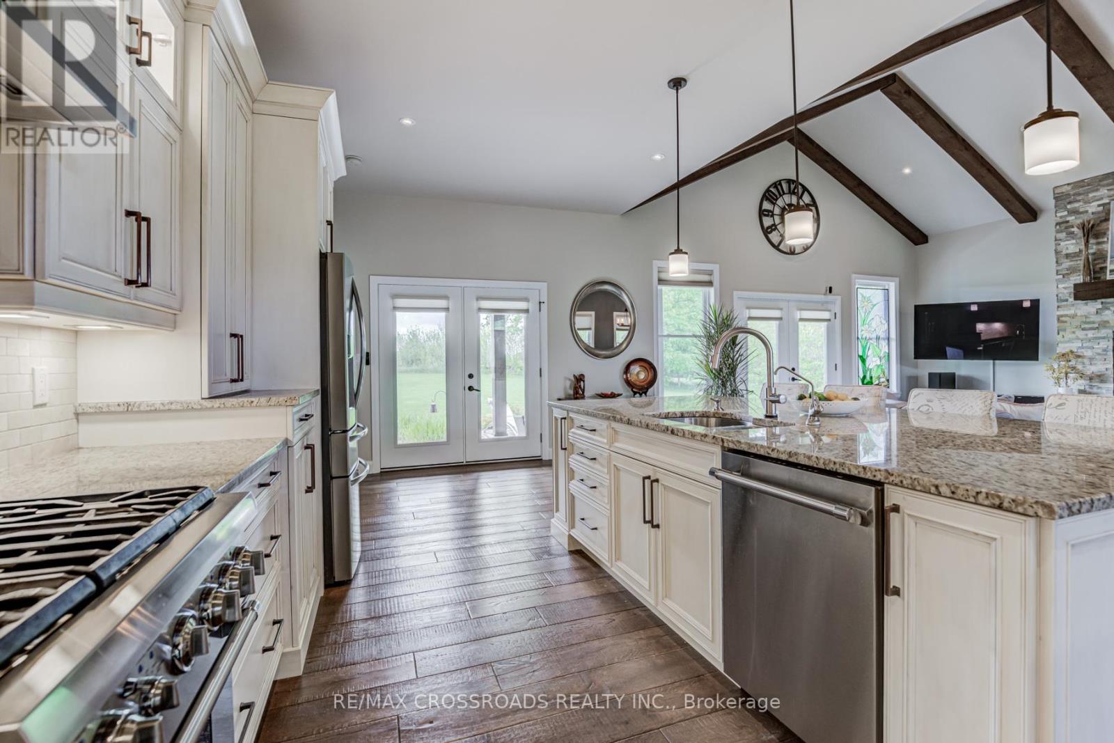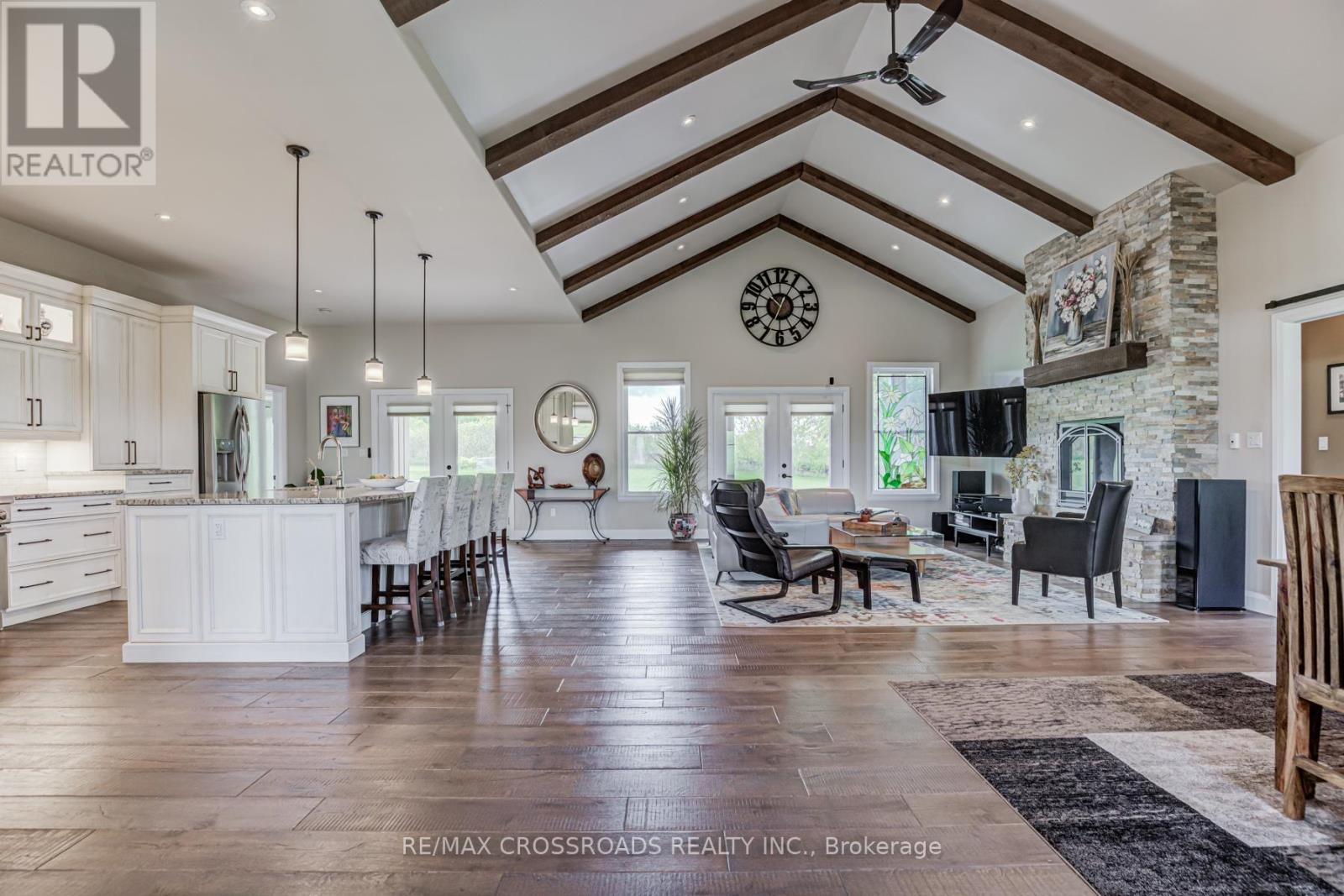 Now's your opportunity to own this exceptional sprawling custom-built bungalow with approx. 3600 sq ft of living space in the coveted Hearthstone Ridge Estates, just 10 minutes to the 401! This stunning home offers 3+1 spacious bdrms & blends luxury, comfort, & country charm in every detail. Upon arrival, you'll be charmed by the striking combination of stone and board-and-batten exterior that complements the rolling countryside along with the professionally designed landscaping & meticulous gardens that surround the home making it the crown jewel of the neighbourhood. Step inside and experience the bright and airy open concept layout. The living room with its soaring cathedral ceilings adorned with wood beams & gas fireplace set the tone for elegant rustic living. The ultimate chefs kitchen is a showstopper, featuring rich wood cabinetry, gleaming granite countertops, premium s/s appliances including a Thermador gas range & dishwasher, & a generous island perfect for entertaining. French doors & large windows throughout invite the outdoors in, offering views of the gardens from every room. The large primary suite is your private retreat with a cozy reading nook overlooking the garden, direct patio access, & a luxurious ensuite w/ quartz countertops, heated floors, & a spacious walk-in multi-jet shower. A huge w/i closet with custom cabinetry add to the suites appeal. On the opposite wing of the home, you'll find two additional well-sized bdrms & a stylish main bath. The fully finished basement expands your living space with a 4th bdrm, full bath, & ultimate man cave complete with billiards, darts, an acoustically treated home theatre area, & plenty of space for an office, gym, & playroom. Storage is plentiful. The private backyard oasis features a covered stone patio, hi-fi audio, gas BBQ, & a large firepit perfect for year-round relaxation or entertaining. If you're seeking peaceful, upscale country living with city convenience, this Hearthstone Ridge gem is it. (id:51158)