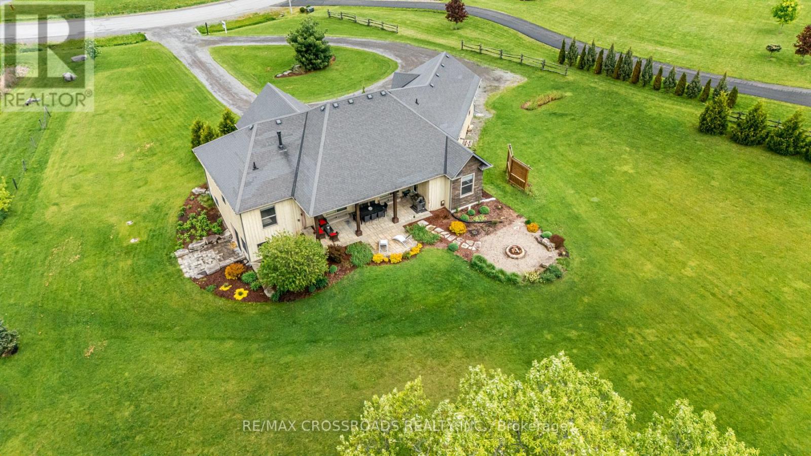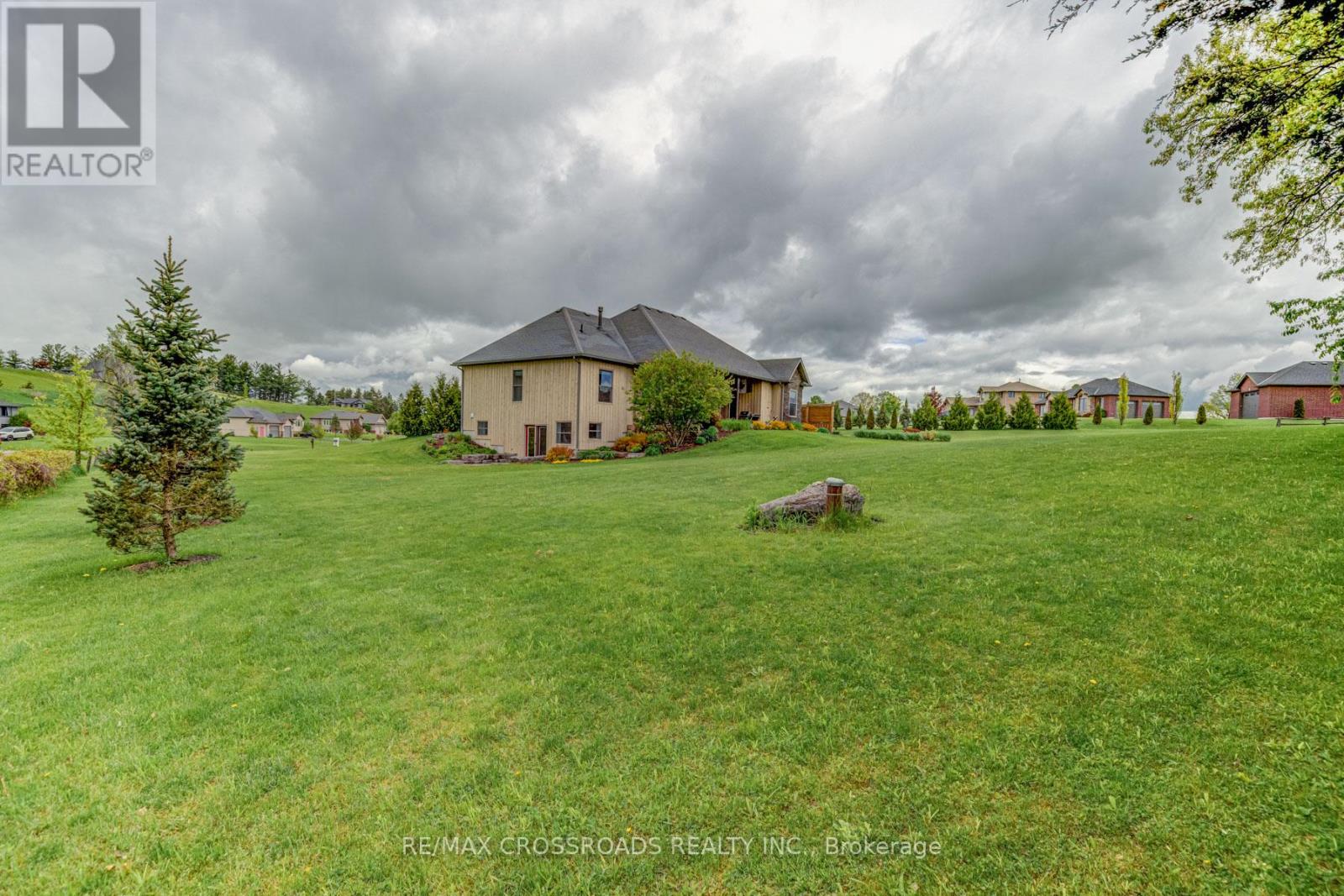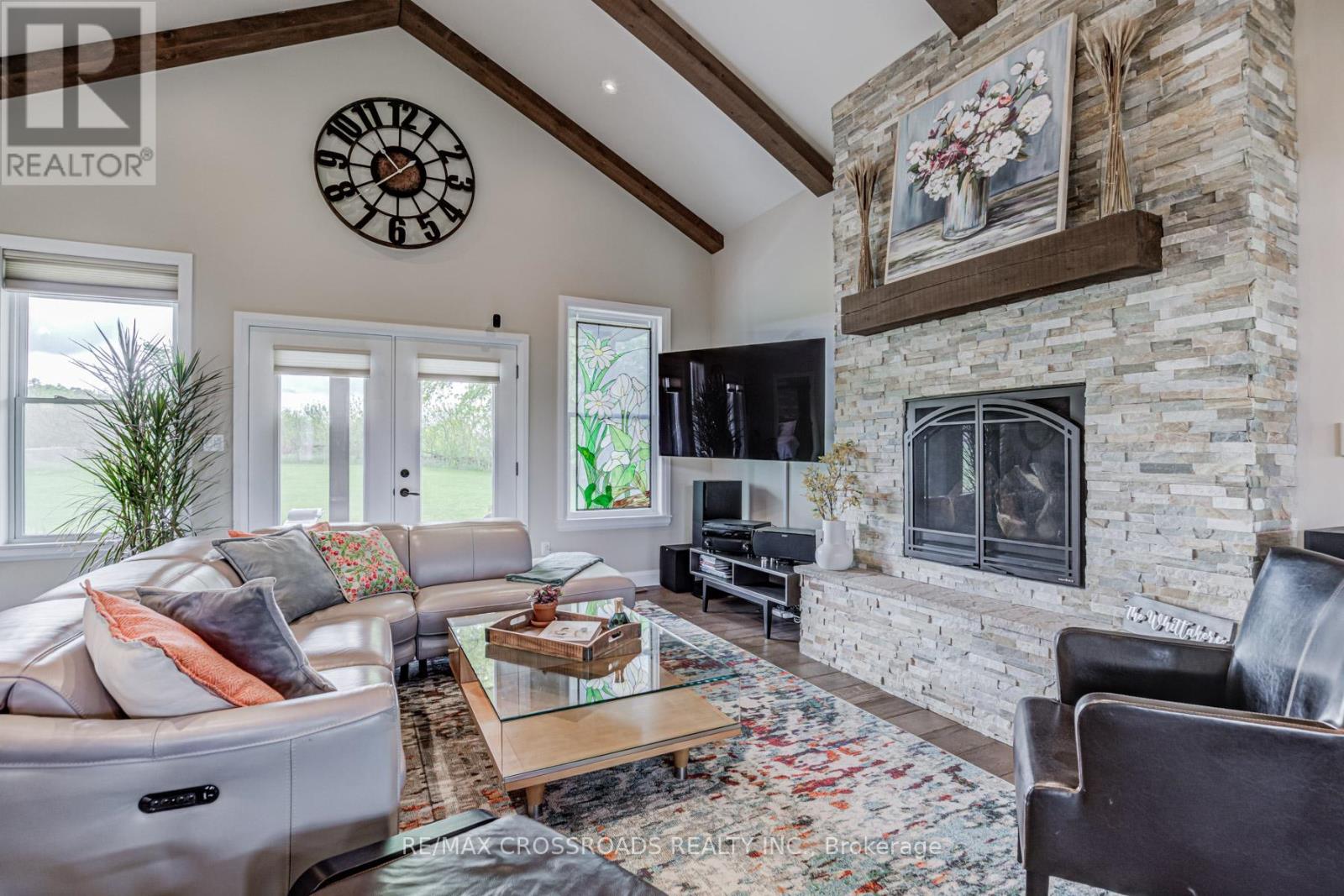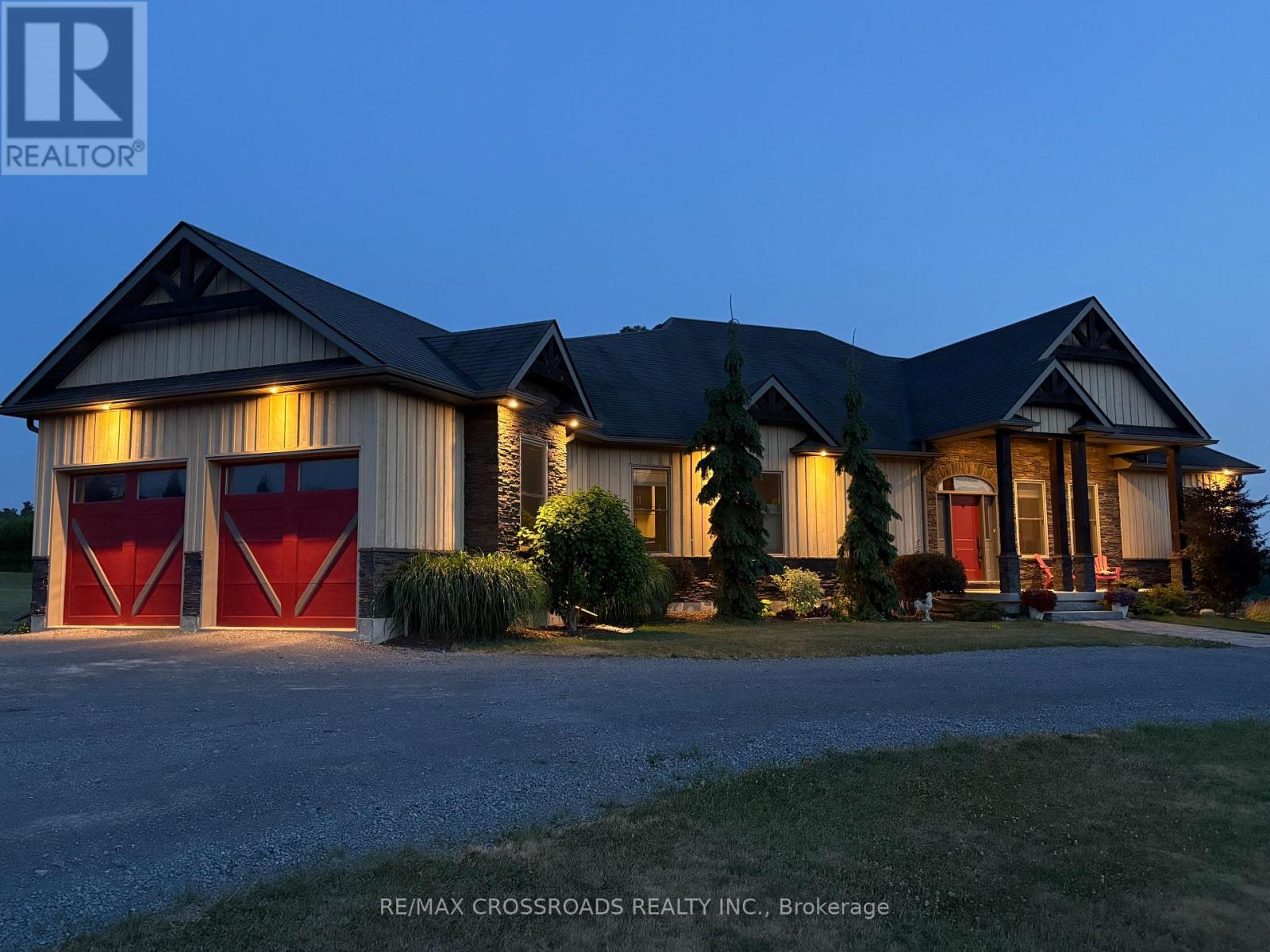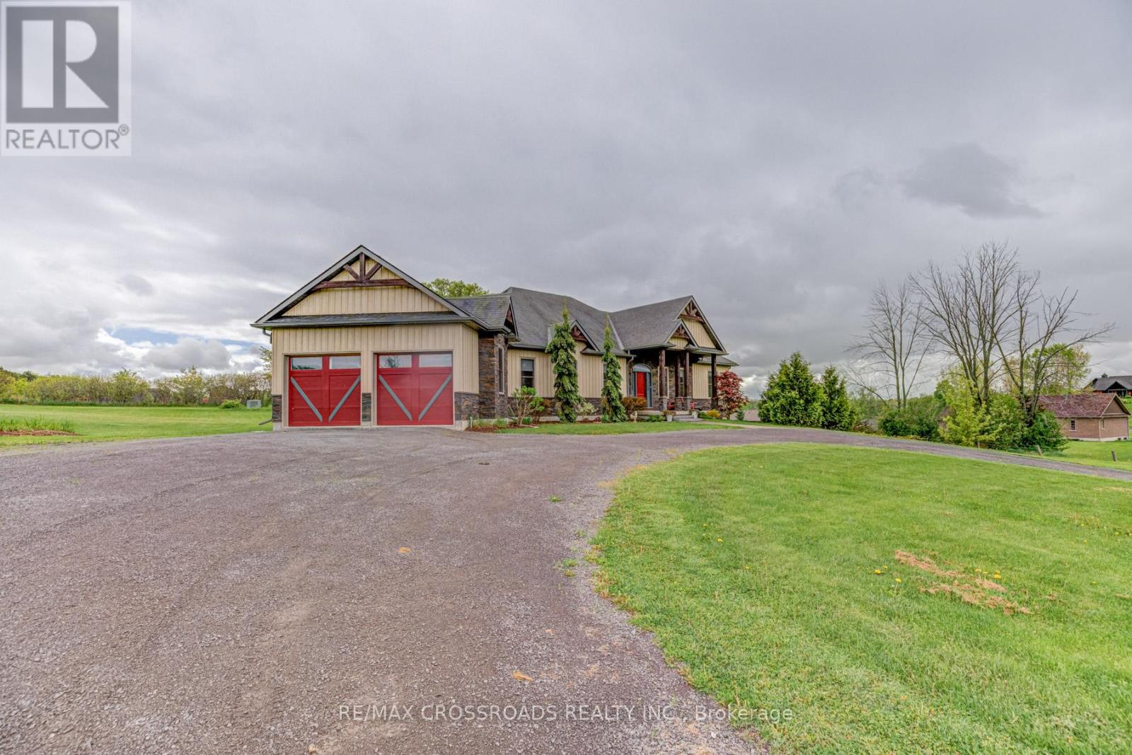 Now's your opportunity to own this exceptional sprawling custom-built bungalow with approx. 3600 sq ft of living space in the coveted Hearthstone Ridge Estates, just 10 minutes to the 401! This stunning home offers 3+1 spacious bdrms & blends luxury, comfort, & country charm in every detail. Upon arrival, you'll be charmed by the striking combination of stone and board-and-batten exterior that complements the rolling countryside along with the professionally designed landscaping & meticulous gardens that surround the home making it the crown jewel of the neighbourhood. Step inside and experience the bright and airy open concept layout. The living room with its soaring cathedral ceilings adorned with wood beams & gas fireplace set the tone for elegant rustic living. The ultimate chefs kitchen is a showstopper, featuring rich wood cabinetry, gleaming granite countertops, premium s/s appliances including a Thermador gas range & dishwasher, & a generous island perfect for entertaining. French doors & large windows throughout invite the outdoors in, offering views of the gardens from every room. The large primary suite is your private retreat with a cozy reading nook overlooking the garden, direct patio access, & a luxurious ensuite w/ quartz countertops, heated floors, & a spacious walk-in multi-jet shower. A huge w/i closet with custom cabinetry add to the suites appeal. On the opposite wing of the home, you'll find two additional well-sized bdrms & a stylish main bath. The fully finished basement expands your living space with a 4th bdrm, full bath, & ultimate man cave complete with billiards, darts, an acoustically treated home theatre area, & plenty of space for an office, gym, & playroom. Storage is plentiful. The private backyard oasis features a covered stone patio, hi-fi audio, gas BBQ, & a large firepit perfect for year-round relaxation or entertaining. If you're seeking peaceful, upscale country living with city convenience, this Hearthstone Ridge gem is it. (id:51158)