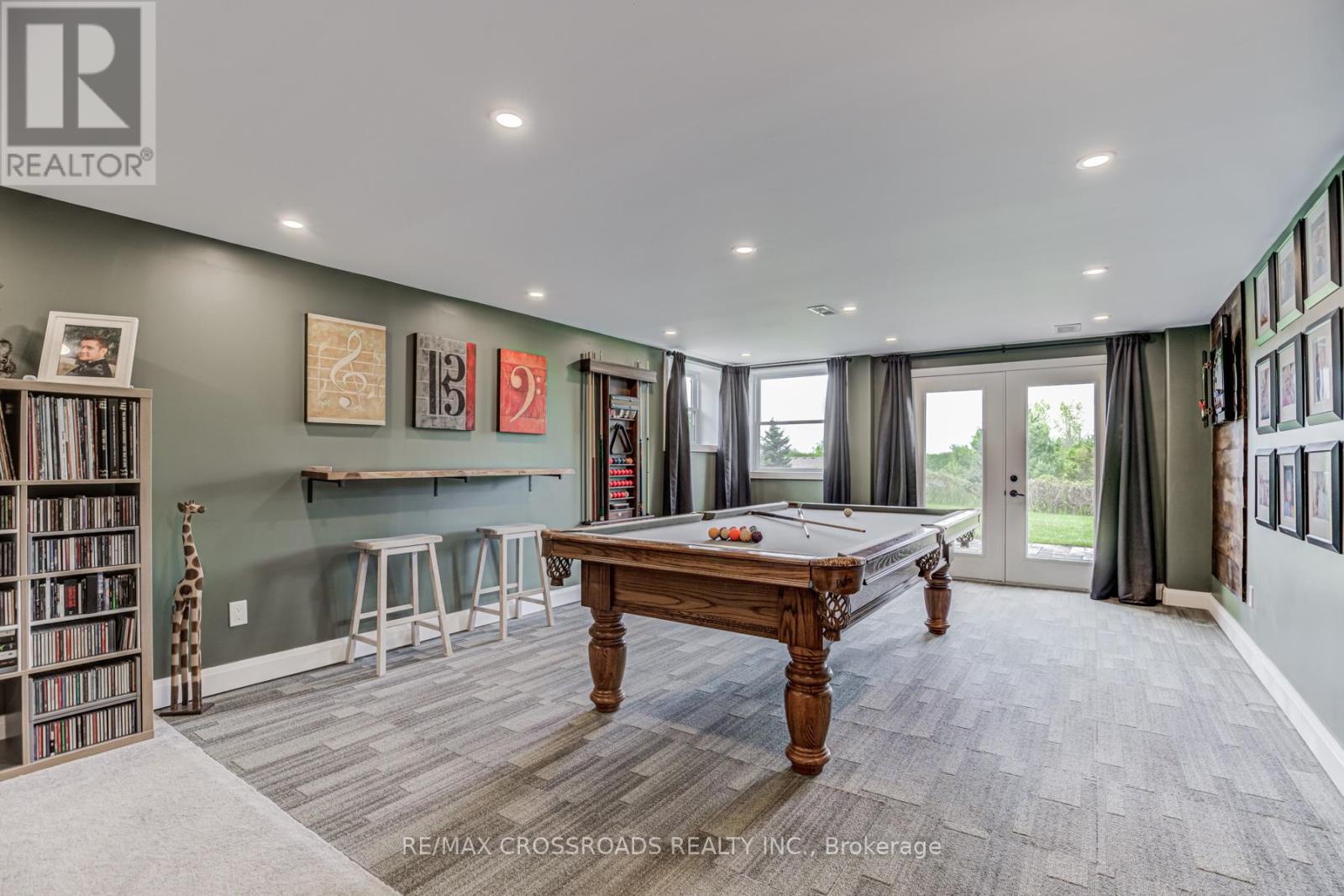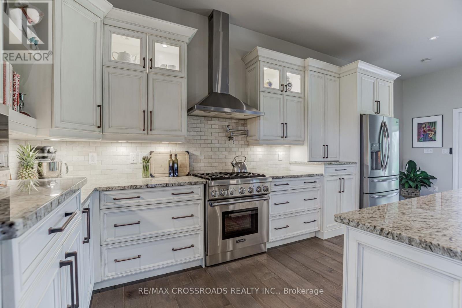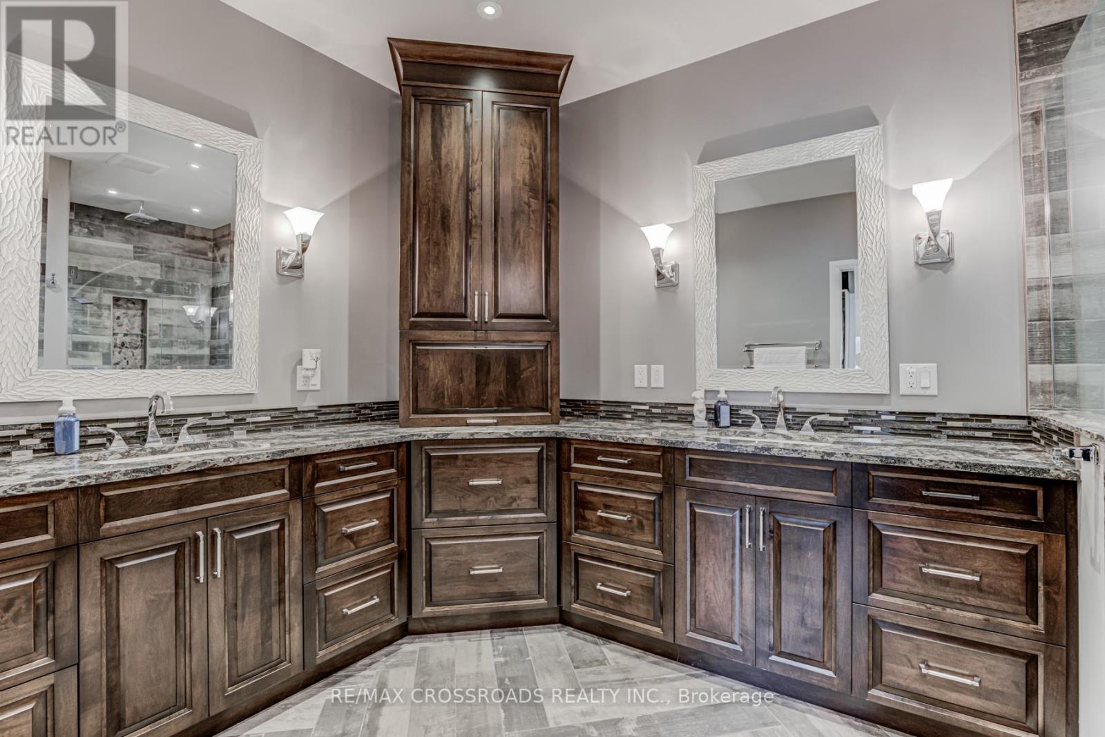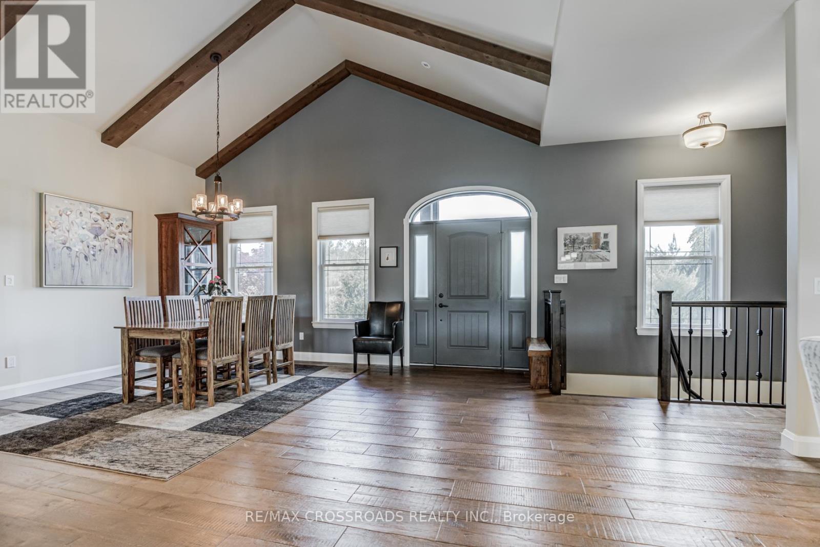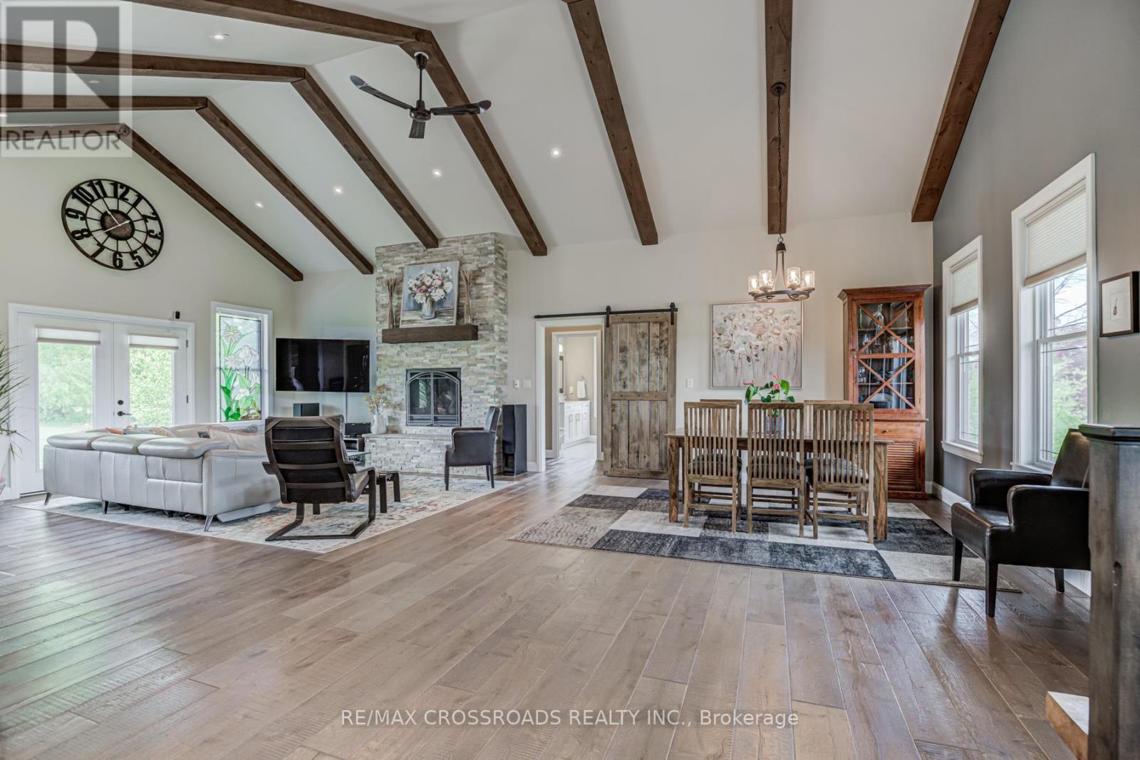 Now's your opportunity to own this exceptional sprawling custom-built bungalow with approx. 3600 sq ft of living space in the coveted Hearthstone Ridge Estates, just 10 minutes to the 401! This stunning home offers 3+1 spacious bdrms & blends luxury, comfort, & country charm in every detail. Upon arrival, you'll be charmed by the striking combination of stone and board-and-batten exterior that complements the rolling countryside along with the professionally designed landscaping & meticulous gardens that surround the home making it the crown jewel of the neighbourhood. Step inside and experience the bright and airy open concept layout. The living room with its soaring cathedral ceilings adorned with wood beams & gas fireplace set the tone for elegant rustic living. The ultimate chefs kitchen is a showstopper, featuring rich wood cabinetry, gleaming granite countertops, premium s/s appliances including a Thermador gas range & dishwasher, & a generous island perfect for entertaining. French doors & large windows throughout invite the outdoors in, offering views of the gardens from every room. The large primary suite is your private retreat with a cozy reading nook overlooking the garden, direct patio access, & a luxurious ensuite w/ quartz countertops, heated floors, & a spacious walk-in multi-jet shower. A huge w/i closet with custom cabinetry add to the suites appeal. On the opposite wing of the home, you'll find two additional well-sized bdrms & a stylish main bath. The fully finished basement expands your living space with a 4th bdrm, full bath, & ultimate man cave complete with billiards, darts, an acoustically treated home theatre area, & plenty of space for an office, gym, & playroom. Storage is plentiful. The private backyard oasis features a covered stone patio, hi-fi audio, gas BBQ, & a large firepit perfect for year-round relaxation or entertaining. If you're seeking peaceful, upscale country living with city convenience, this Hearthstone Ridge gem is it. (id:51158)