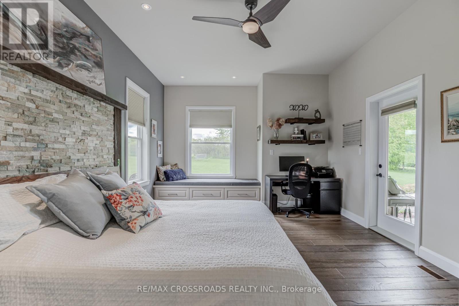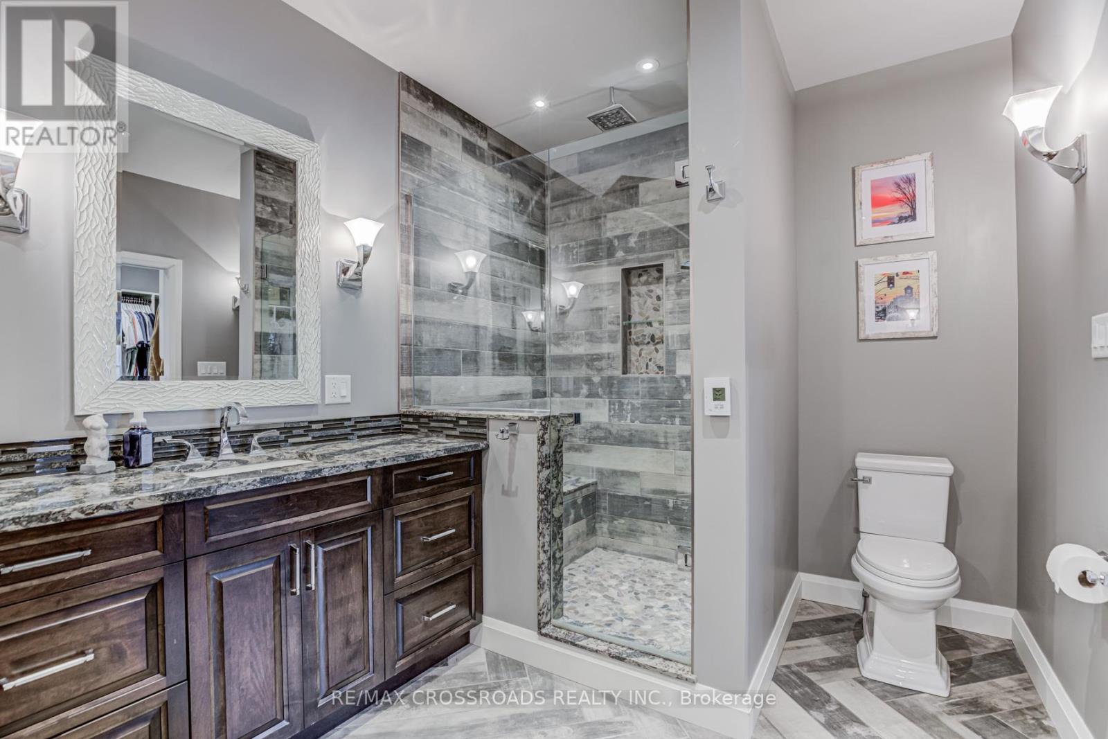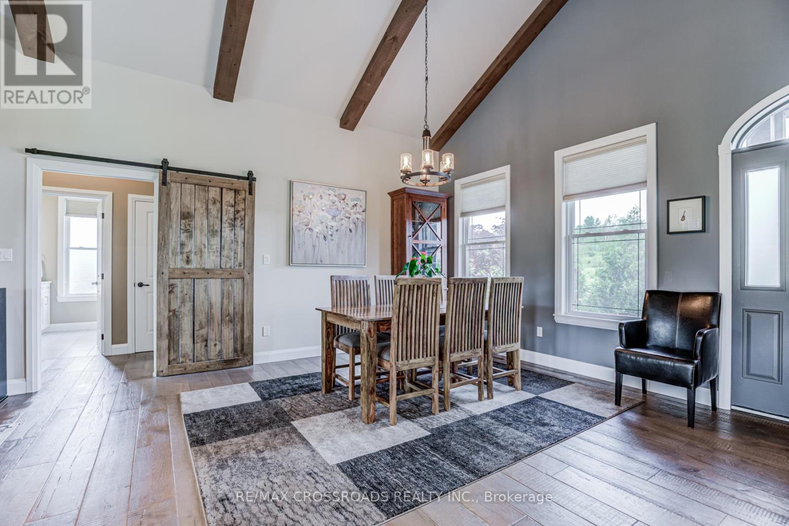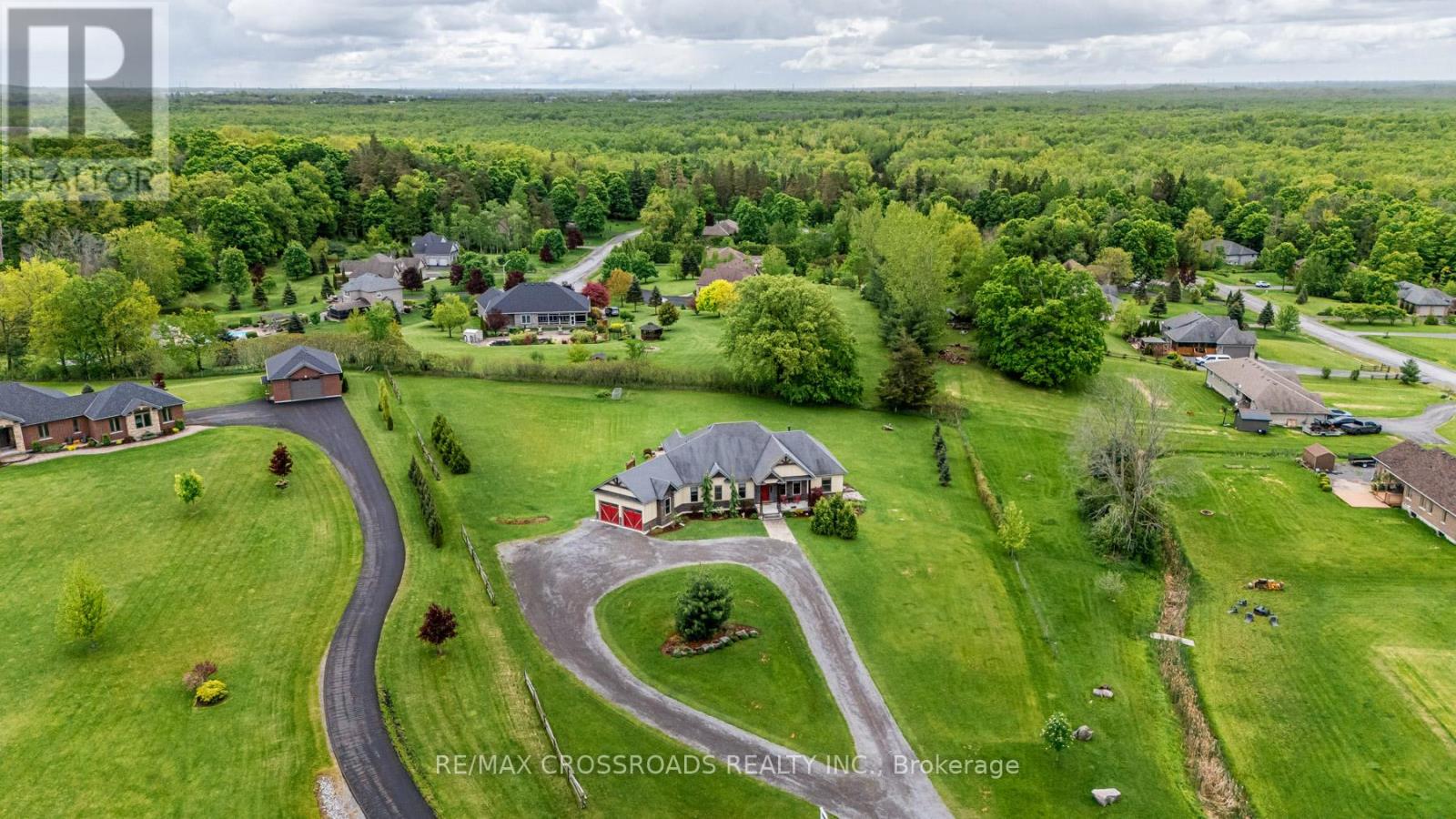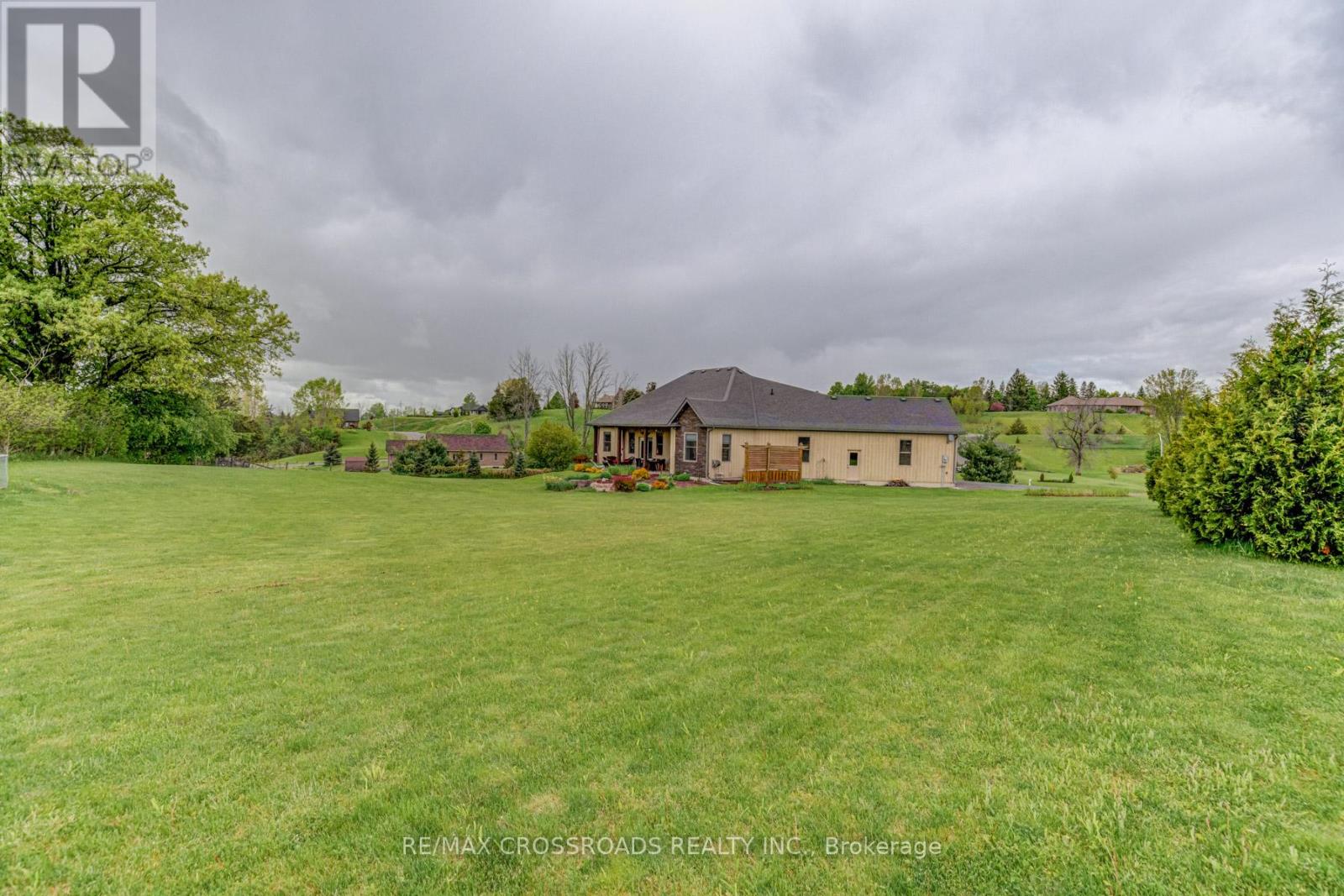 Now's your opportunity to own this exceptional sprawling custom-built bungalow with approx. 3600 sq ft of living space in the coveted Hearthstone Ridge Estates, just 10 minutes to the 401! This stunning home offers 3+1 spacious bdrms & blends luxury, comfort, & country charm in every detail. Upon arrival, you'll be charmed by the striking combination of stone and board-and-batten exterior that complements the rolling countryside along with the professionally designed landscaping & meticulous gardens that surround the home making it the crown jewel of the neighbourhood. Step inside and experience the bright and airy open concept layout. The living room with its soaring cathedral ceilings adorned with wood beams & gas fireplace set the tone for elegant rustic living. The ultimate chefs kitchen is a showstopper, featuring rich wood cabinetry, gleaming granite countertops, premium s/s appliances including a Thermador gas range & dishwasher, & a generous island perfect for entertaining. French doors & large windows throughout invite the outdoors in, offering views of the gardens from every room. The large primary suite is your private retreat with a cozy reading nook overlooking the garden, direct patio access, & a luxurious ensuite w/ quartz countertops, heated floors, & a spacious walk-in multi-jet shower. A huge w/i closet with custom cabinetry add to the suites appeal. On the opposite wing of the home, you'll find two additional well-sized bdrms & a stylish main bath. The fully finished basement expands your living space with a 4th bdrm, full bath, & ultimate man cave complete with billiards, darts, an acoustically treated home theatre area, & plenty of space for an office, gym, & playroom. Storage is plentiful. The private backyard oasis features a covered stone patio, hi-fi audio, gas BBQ, & a large firepit perfect for year-round relaxation or entertaining. If you're seeking peaceful, upscale country living with city convenience, this Hearthstone Ridge gem is it. (id:51158)