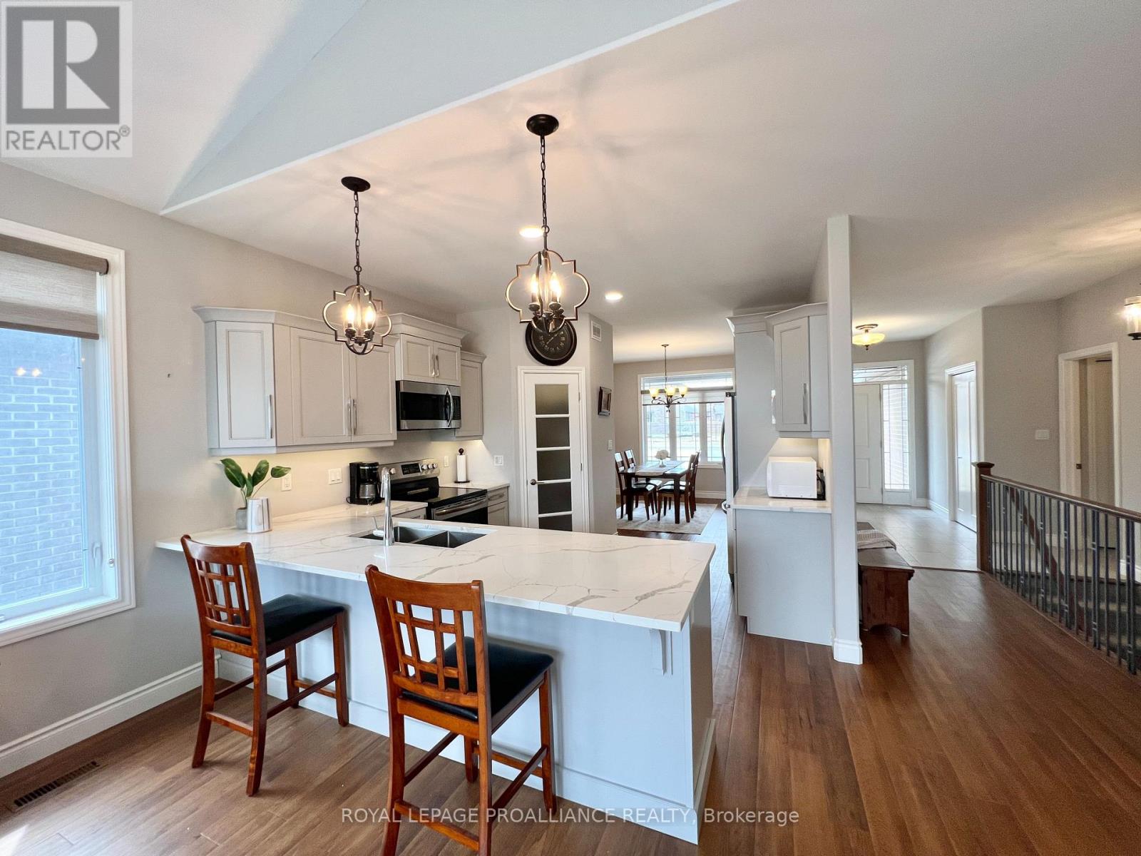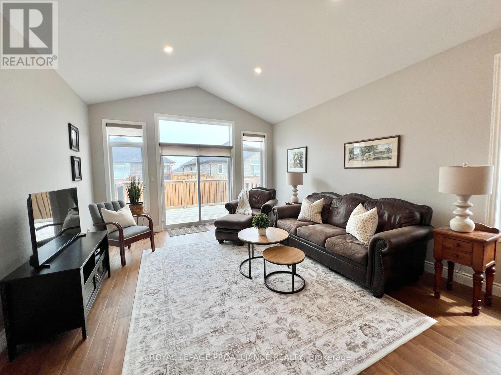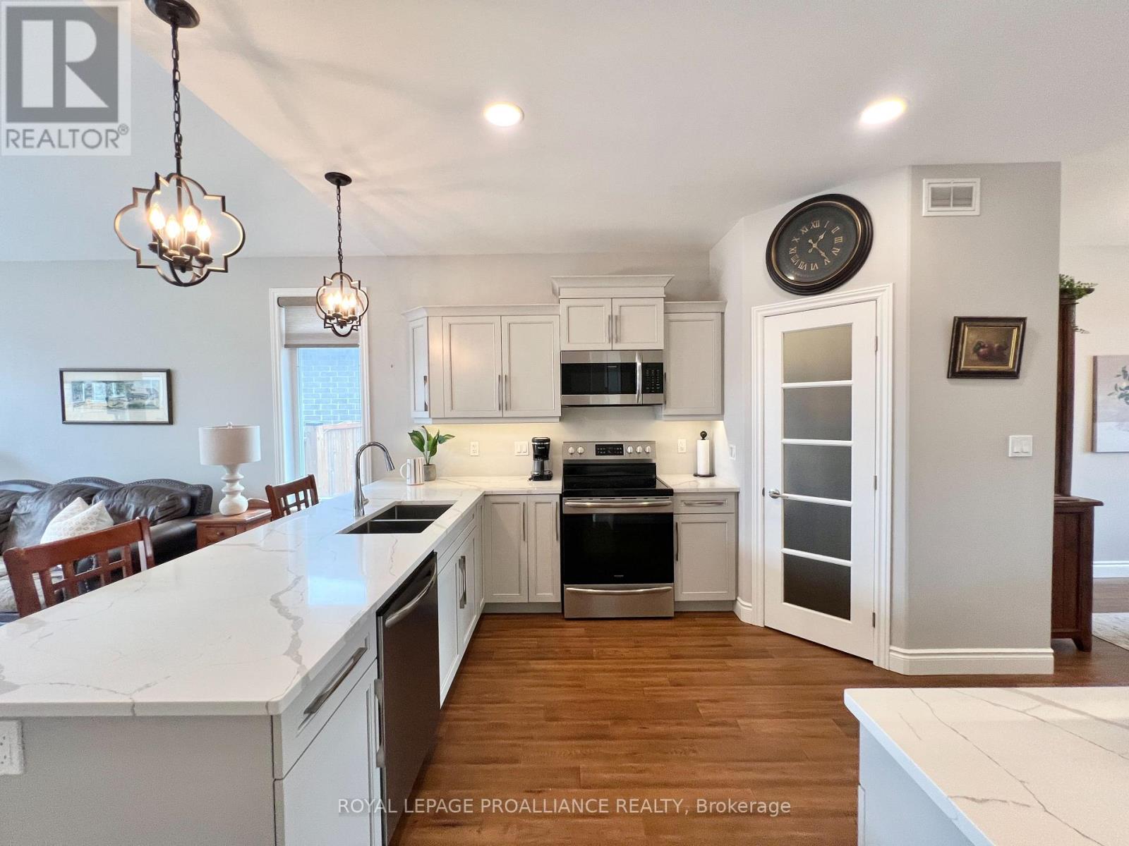 This immaculate all-brick bungalow, built in 2019 by Devanco Homes, is located in one of Belleville's most sought-after family neighbourhoods and shows like new from top to bottom. Step inside to a bright and welcoming foyer, with a front dining room framed by a large window that fills the space with natural light. The open-concept main living area is perfect for both everyday life and entertaining, featuring a vaulted ceiling in the living room and seamless flow into the kitchen. The kitchen features neutral cabinetry, quartz countertops, stainless steel appliances, a corner pantry, and a large island ideal for gathering with family and friends.The main level offers two bedrooms, including a spacious primary retreat with a walk-in closet and a private three-piece ensuite with a glass-tiled shower. A full four-piece bathroom completes the level. Downstairs, the fully finished basement-builder completed-continues the modern, like-new feel with a generous rec room, two additional spacious bedrooms, and another full four-piece bathroom. It's perfect for guests, hobbies, or flexible living space. Outside, enjoy a charming covered front porch, a double garage, and patio doors from the living room to the backyard deck, ideal for relaxing or entertaining on sunny days. Thoughtful details throughout include hardwood flooring on the main level, warm-toned laminate in the lower level, custom window coverings, and finishes that have been meticulously maintained...yes, I know people always say that, but this one really is! Settlers Ridge Estates offers wide lots, quiet streets, scenic walking paths, parks, and easy access to all shopping and amenities, combining comfort, convenience, and a lifestyle you'll love. (id:51158)
