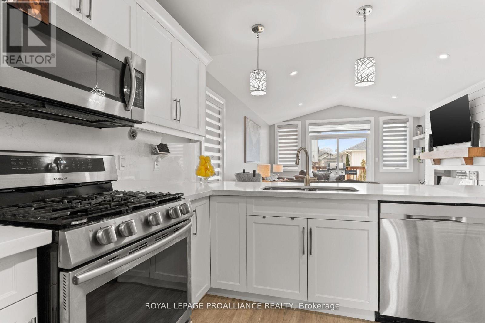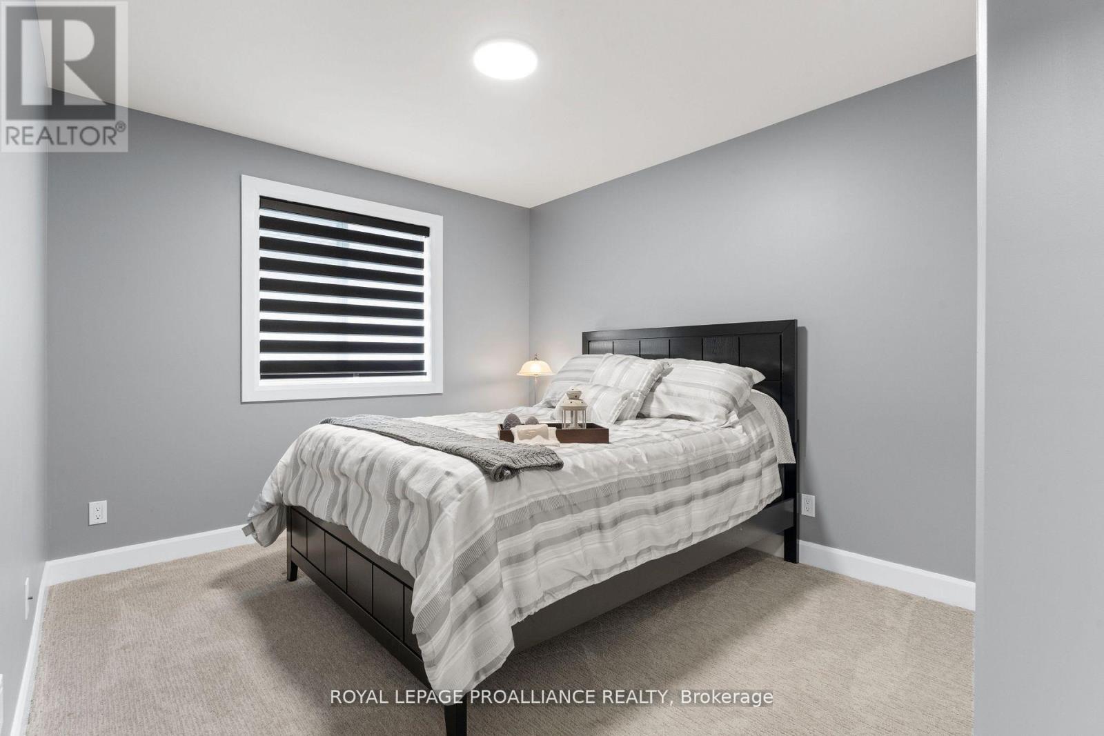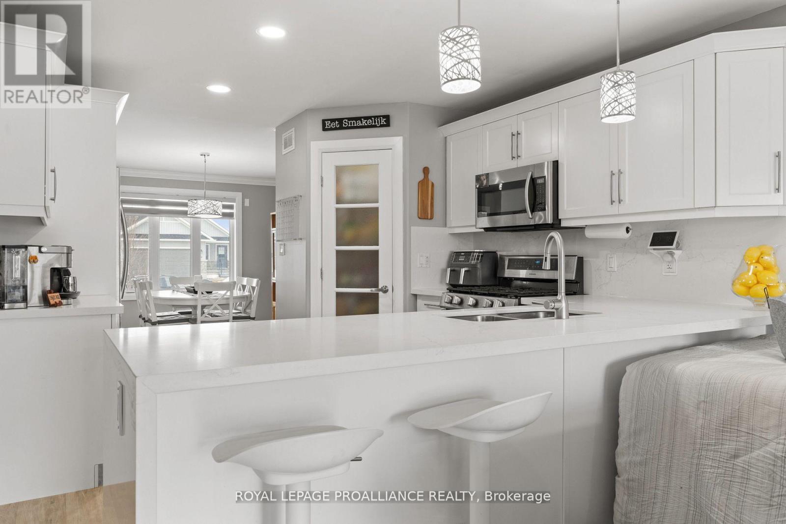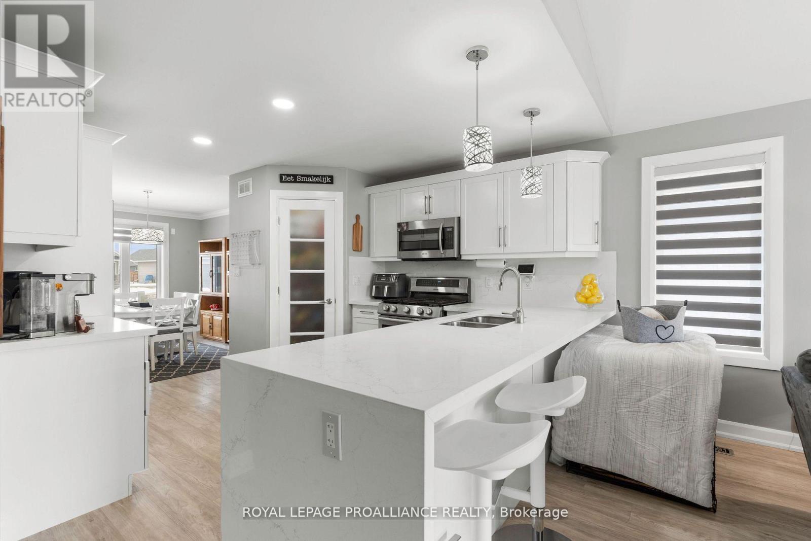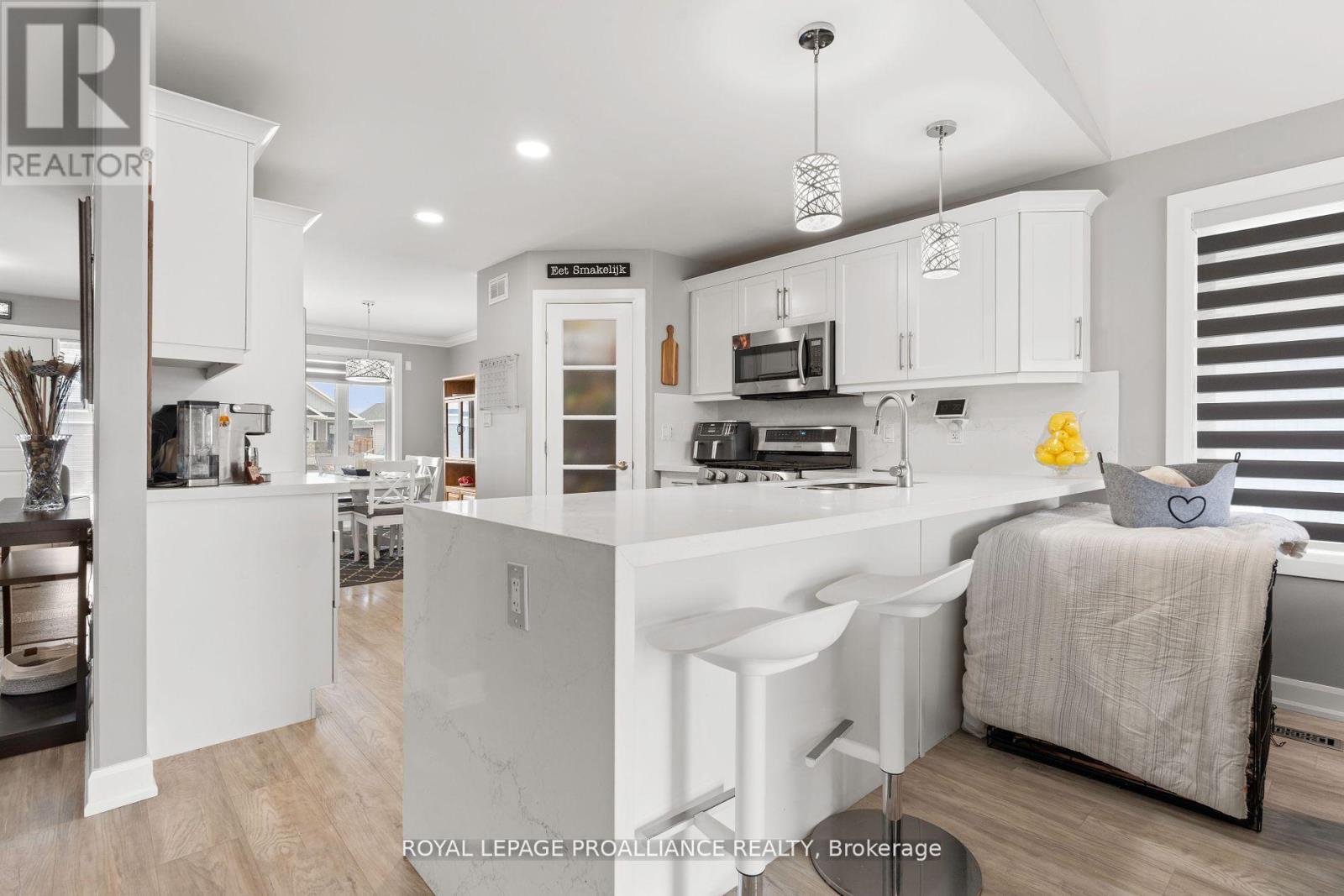 Welcome to 90 Aldersgate Drive, a stunning 1437 sq ft bungalow built by Duvanco Homes in 2019. This meticulously designed home offers an open-concept floor plan, filled with natural light and featuring modern, luxurious finishes throughout. The heart of the home is the gourmet kitchen, which showcases a beautiful quartz countertop with a striking waterfall edge, a spacious breakfast bar, a walk-in pantry, and high-end stainless steel appliances, including a gas stove-perfect for cooking and entertaining. The formal dining area is ideal for family gatherings, while the adjacent kitchen and living area create an inviting space for relaxation and socializing. The living room is highlighted by a custom-built wall unit with an electric fireplace, and patio doors that lead out to the back deck and yard, offering seamless indoor-outdoor living. The spacious primary bedroom is a true retreat, featuring a stylish main accent wall and a luxurious 4-piece en-suite bath. A second bedroom a main floor bath, and a laundry room with inside entry from the 1.5 car garage complete the main level. The fully finished lower level is perfect for additional living space, with a large rec room, two additional bedrooms, and a 4-piece bathroom. There's also a generous storage/utility room offering plenty of room for all your storage needs. Located in a highly sought-after west-end subdivision, just minutes from Hwy 401 and CFB Trenton, this home is the ideal combination of comfort, style and convenience. Don't miss out on the opportunity to make this beautiful home yours. (id:51158)