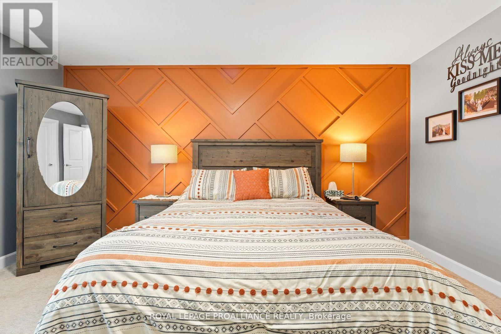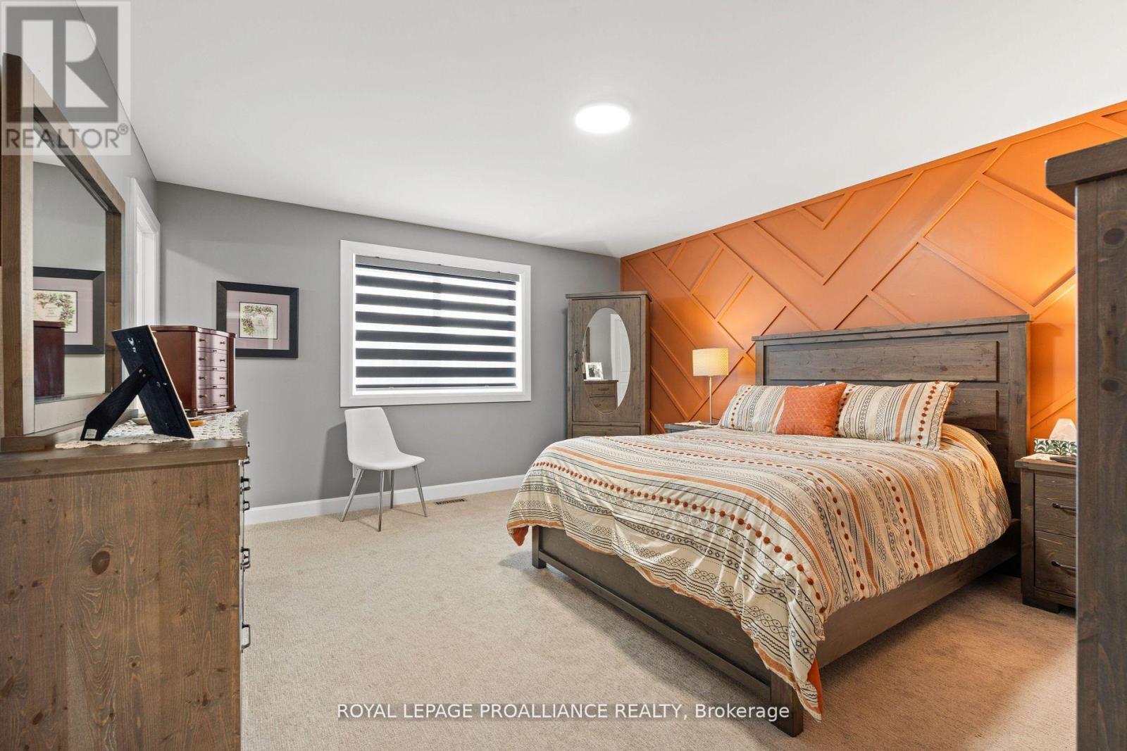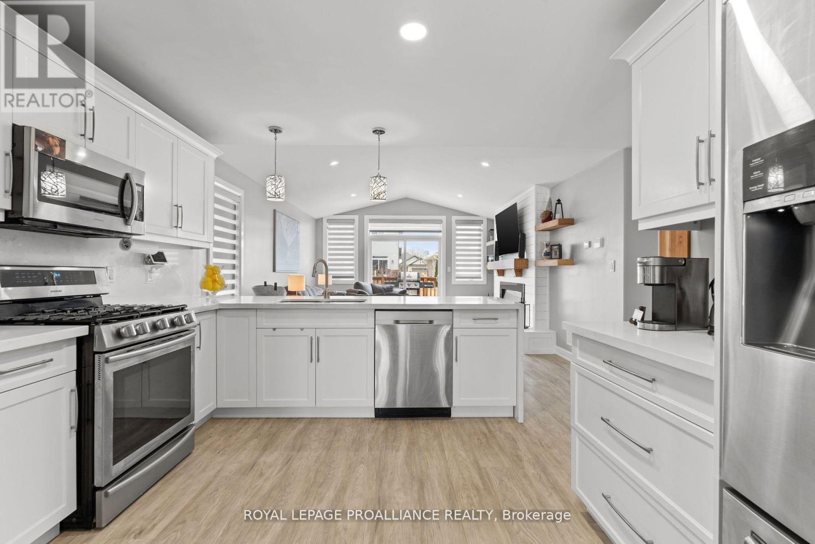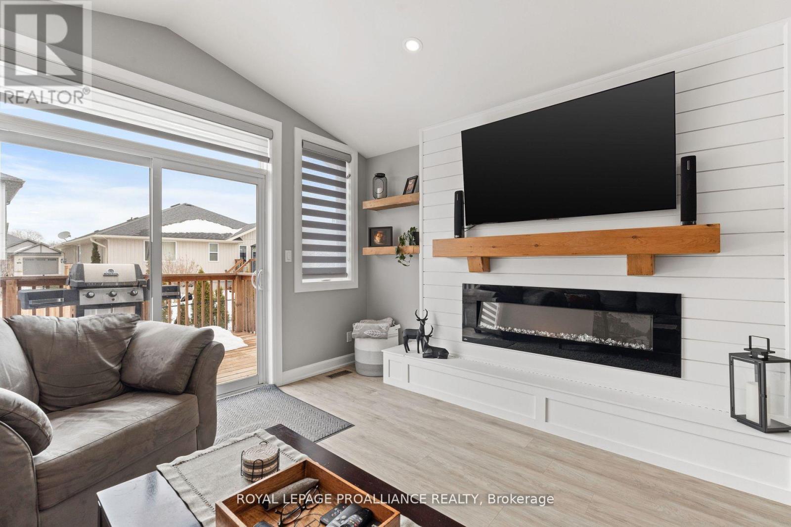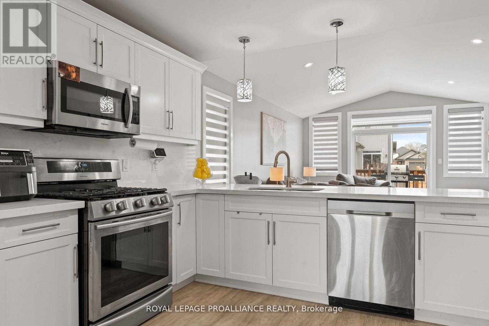 Welcome to 90 Aldersgate Drive, a stunning 1437 sq ft bungalow built by Duvanco Homes in 2019. This meticulously designed home offers an open-concept floor plan, filled with natural light and featuring modern, luxurious finishes throughout. The heart of the home is the gourmet kitchen, which showcases a beautiful quartz countertop with a striking waterfall edge, a spacious breakfast bar, a walk-in pantry, and high-end stainless steel appliances, including a gas stove-perfect for cooking and entertaining. The formal dining area is ideal for family gatherings, while the adjacent kitchen and living area create an inviting space for relaxation and socializing. The living room is highlighted by a custom-built wall unit with an electric fireplace, and patio doors that lead out to the back deck and yard, offering seamless indoor-outdoor living. The spacious primary bedroom is a true retreat, featuring a stylish main accent wall and a luxurious 4-piece en-suite bath. A second bedroom a main floor bath, and a laundry room with inside entry from the 1.5 car garage complete the main level. The fully finished lower level is perfect for additional living space, with a large rec room, two additional bedrooms, and a 4-piece bathroom. There's also a generous storage/utility room offering plenty of room for all your storage needs. Located in a highly sought-after west-end subdivision, just minutes from Hwy 401 and CFB Trenton, this home is the ideal combination of comfort, style and convenience. Don't miss out on the opportunity to make this beautiful home yours. (id:51158)
