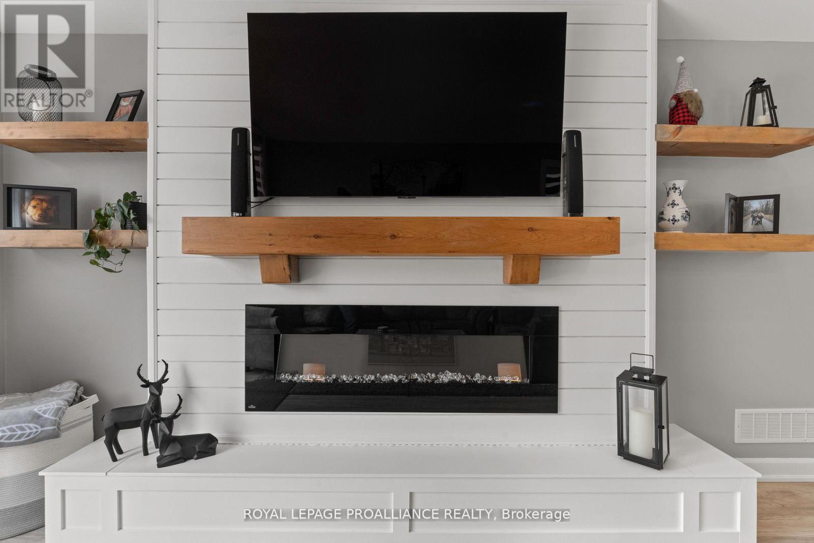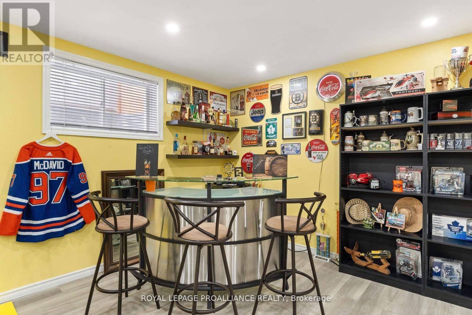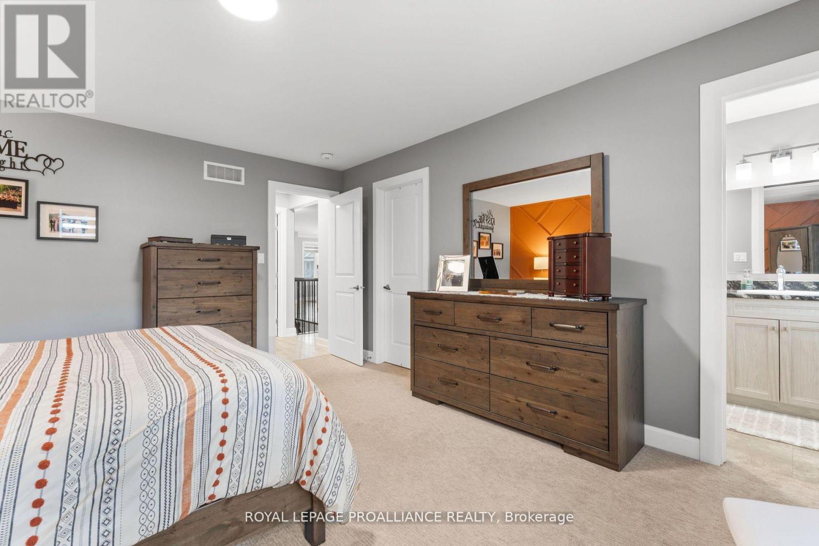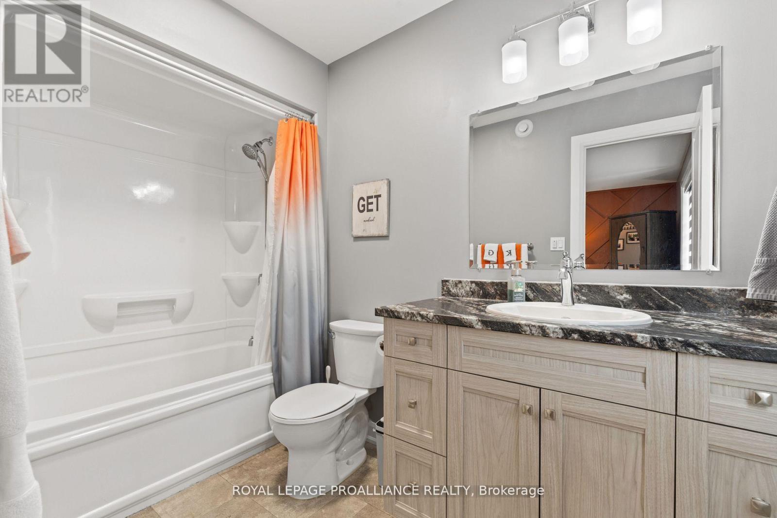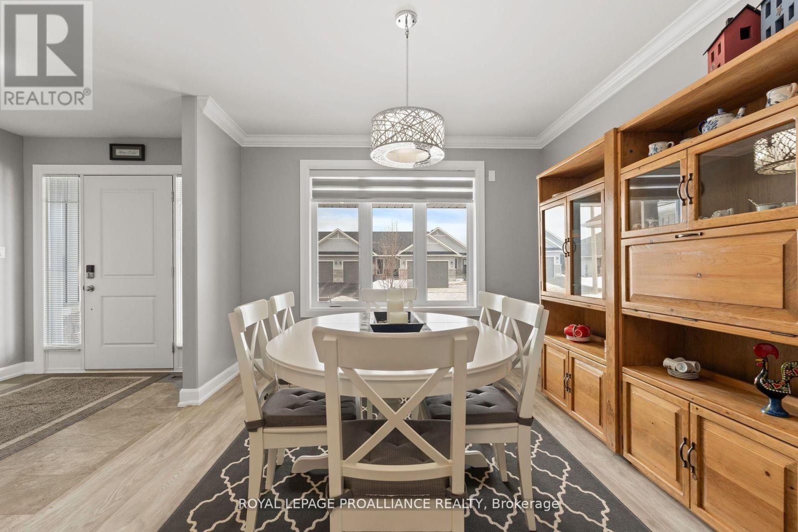 Welcome to 90 Aldersgate Drive, a stunning 1437 sq ft bungalow built by Duvanco Homes in 2019. This meticulously designed home offers an open-concept floor plan, filled with natural light and featuring modern, luxurious finishes throughout. The heart of the home is the gourmet kitchen, which showcases a beautiful quartz countertop with a striking waterfall edge, a spacious breakfast bar, a walk-in pantry, and high-end stainless steel appliances, including a gas stove-perfect for cooking and entertaining. The formal dining area is ideal for family gatherings, while the adjacent kitchen and living area create an inviting space for relaxation and socializing. The living room is highlighted by a custom-built wall unit with an electric fireplace, and patio doors that lead out to the back deck and yard, offering seamless indoor-outdoor living. The spacious primary bedroom is a true retreat, featuring a stylish main accent wall and a luxurious 4-piece en-suite bath. A second bedroom a main floor bath, and a laundry room with inside entry from the 1.5 car garage complete the main level. The fully finished lower level is perfect for additional living space, with a large rec room, two additional bedrooms, and a 4-piece bathroom. There's also a generous storage/utility room offering plenty of room for all your storage needs. Located in a highly sought-after west-end subdivision, just minutes from Hwy 401 and CFB Trenton, this home is the ideal combination of comfort, style and convenience. Don't miss out on the opportunity to make this beautiful home yours. (id:51158)