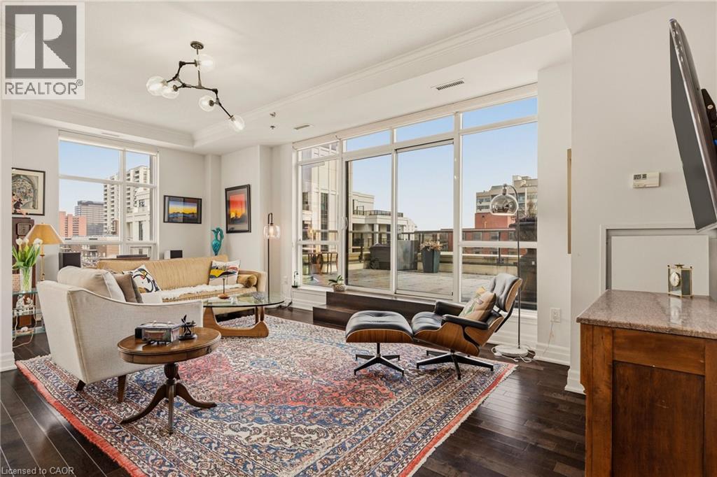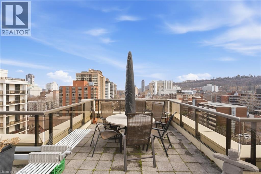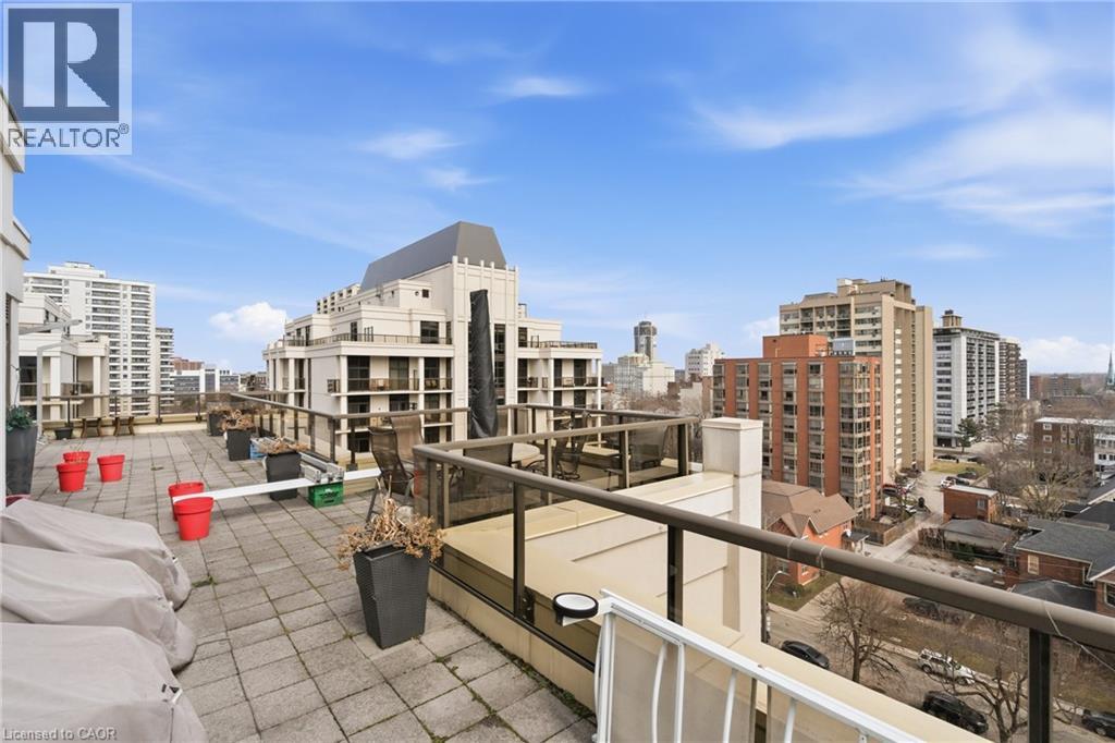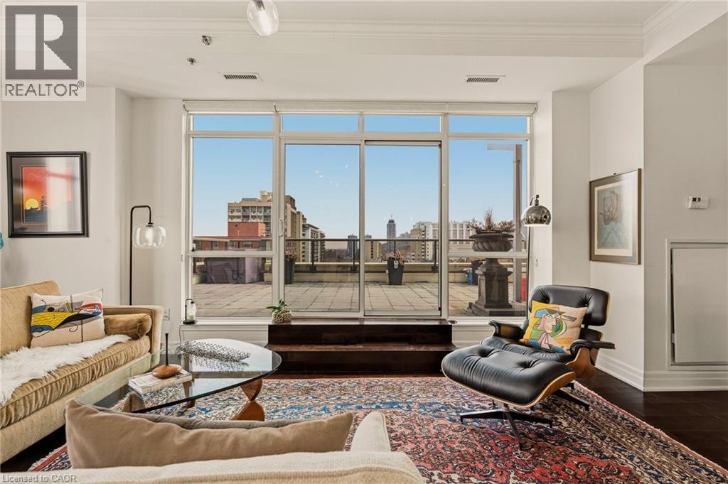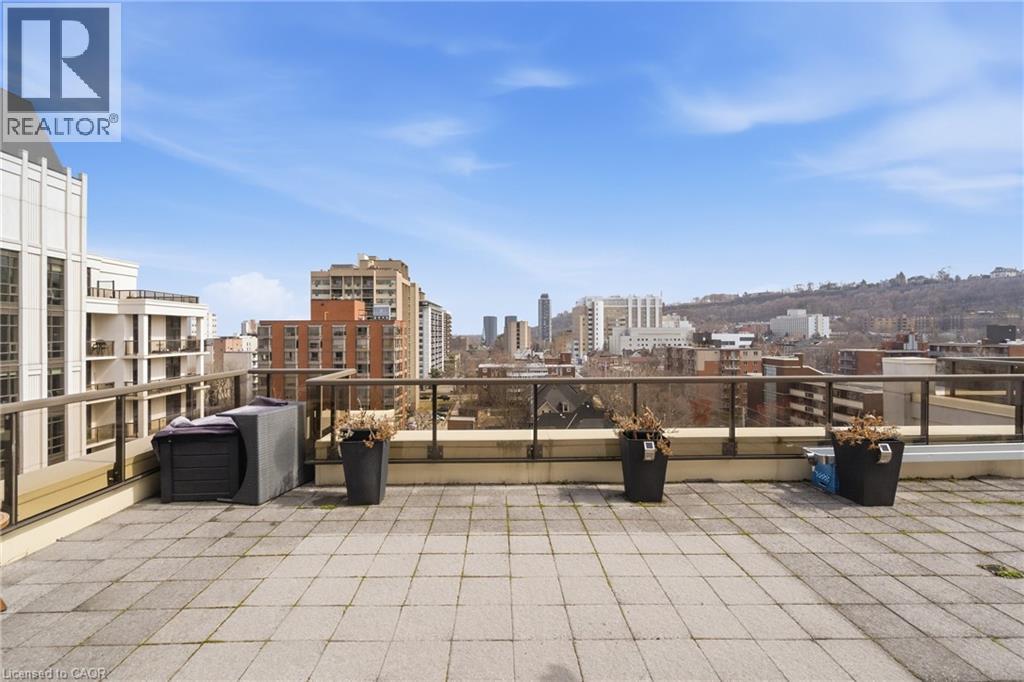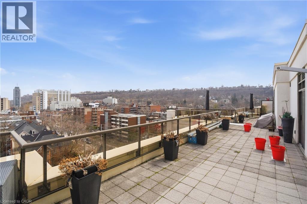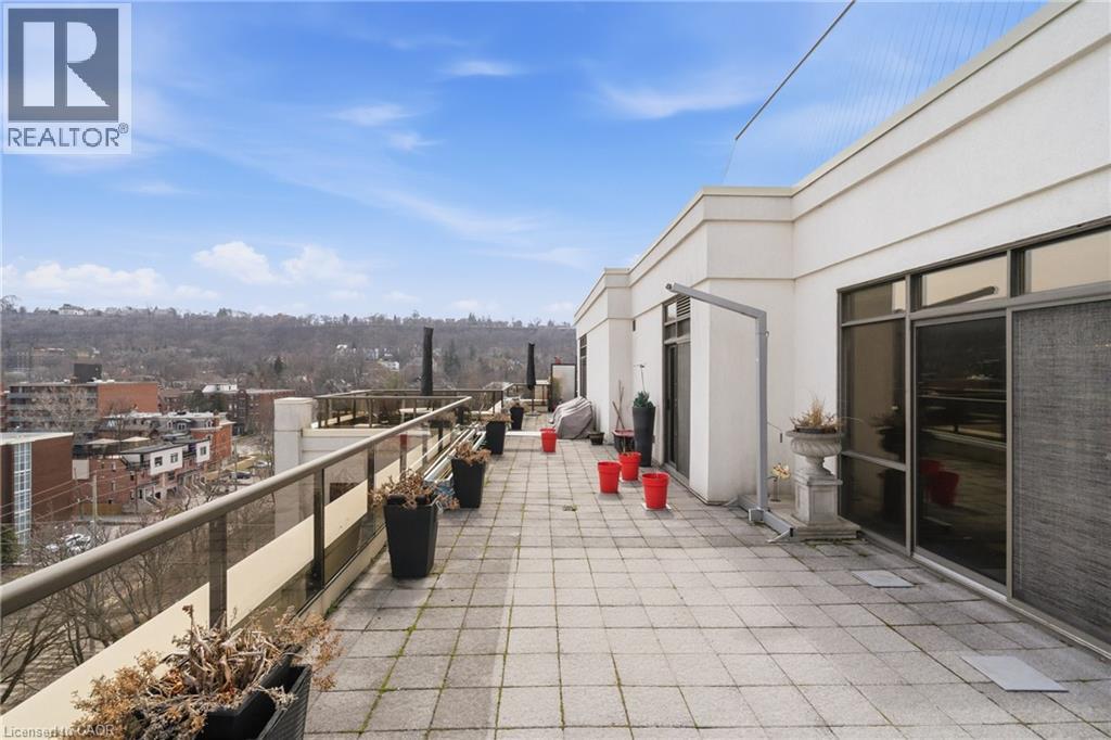 Perched above the vibrant core of downtown Hamilton, this extraordinary penthouse redefines condo living with an unmatched blend of space, style, and outdoor luxury. Spanning an impressive 1,740 sq ft, this rare corner suite is bathed in natural light and showcases sweeping south-eastern views of the city skyline and the stunning escarpment from virtually every angle. Step inside to a thoughtfully designed open-concept layout that offers both flow and distinction, with unique living spaces that cater to everyday comfort and effortless entertaining. The living room and kitchen are the heart of the home, beautifully appointed with high-end finishes, striking stone countertops, and a generous island with bar seating—perfect for gathering with friends or preparing meals in style. Floor-to-ceiling windows and a sliding glass walk-out seamlessly connect the indoors to an extraordinary outdoor experience. The crown jewel? An expansive private rooftop terrace of almost 1,400 sq ft—an entertainer’s dream and a true urban oasis accessible from the living room, den, and primary bedroom. Whether you're hosting summer soirées, enjoying morning coffee, or unwinding under the stars, this space delivers a lifestyle rarely found in condo living. The bright and spacious primary suite features a 3-piece ensuite and a large walk-in closet. A well-proportioned second bedroom offers its own private balcony retreat, while the versatile den is ideal for a home office or guest space. A 4-piece bathroom, and convenient in-suite laundry complete this exceptional offering. Residents also enjoy a Party Room, Exercise Room and dedicated Bike Room. All of this in a prime downtown location, steps to Hamilton’s best dining, shopping, schools, and transit—where city living meets elevated comfort in a truly one-of-a-kind penthouse residence. (id:51158)