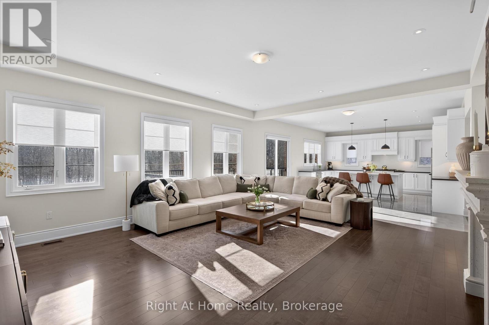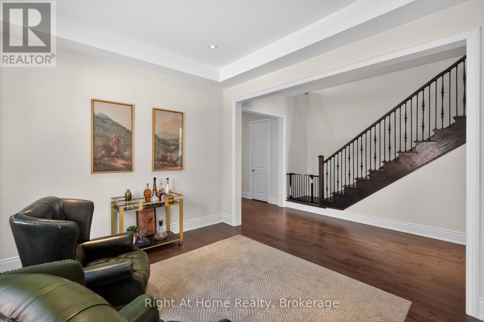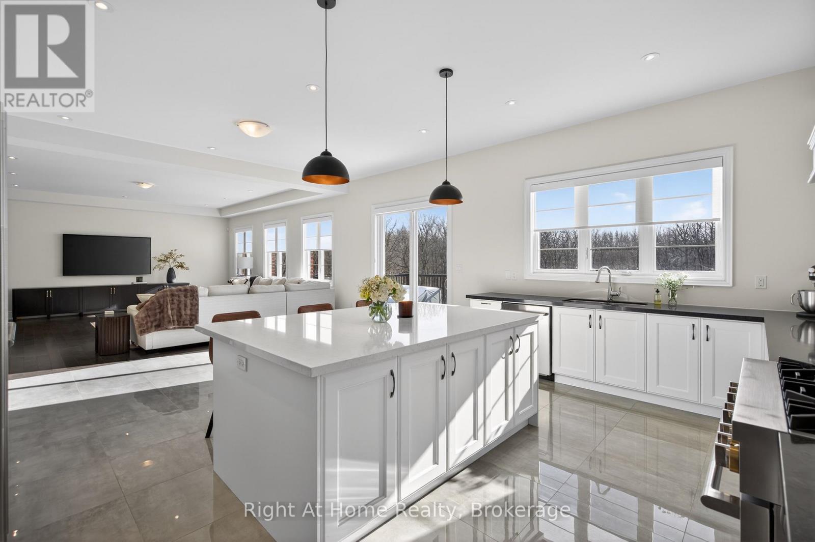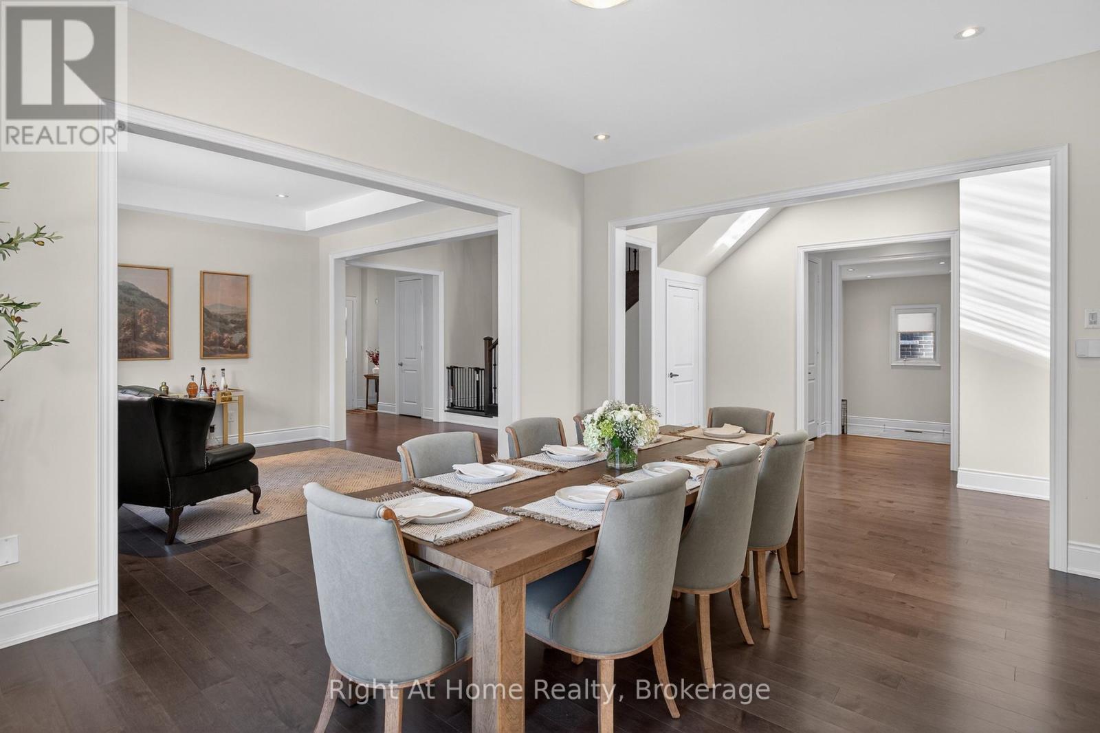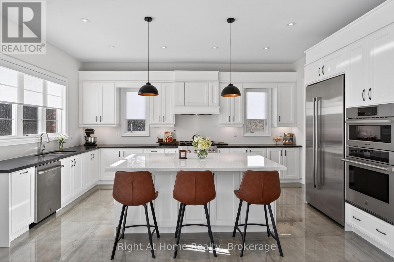 Stunning 2023-built home offering 5 Bedrooms, 6 Bathrooms in over 5,000 sq.ft. of living space backing onto private treed greenspace. Main floor features a home office with built-ins, open concept great room with gas fireplace and large windows, and an entertainer's kitchen with sit-up island, stainless steel appliances, 6-burner gas stove, built-in wall oven and microwave, walk-in pantry, butler's servery and plenty of cupboard space. Sliding doors lead to a 525 sq. ft. deck overlooking nature. Large mudroom with garage access and main floor powder room.Upper level offers hardwood flooring, a luxury primary suite with double doors, his and hers walk-in closets and a 5-piece spa ensuite with a standalone tub, double vanities and a water closet. Four additional generously sized bedrooms each feature walk-in closets and ensuite baths. The upper level also includes a spacious laundry room with ample cabinetry and large work surface.Bright walk-out basement with two staircases, sliding doors to the yard, and a professional gym included (see exclusions). The lower level offers exceptional flexibility with space that can accommodate a wide range of custom options, including home theatre, additional bedrooms or in-law suite potential. Over $200,000 in upgrades throughout. Exceptional layout and a highly sought-after setting. (id:51158)
