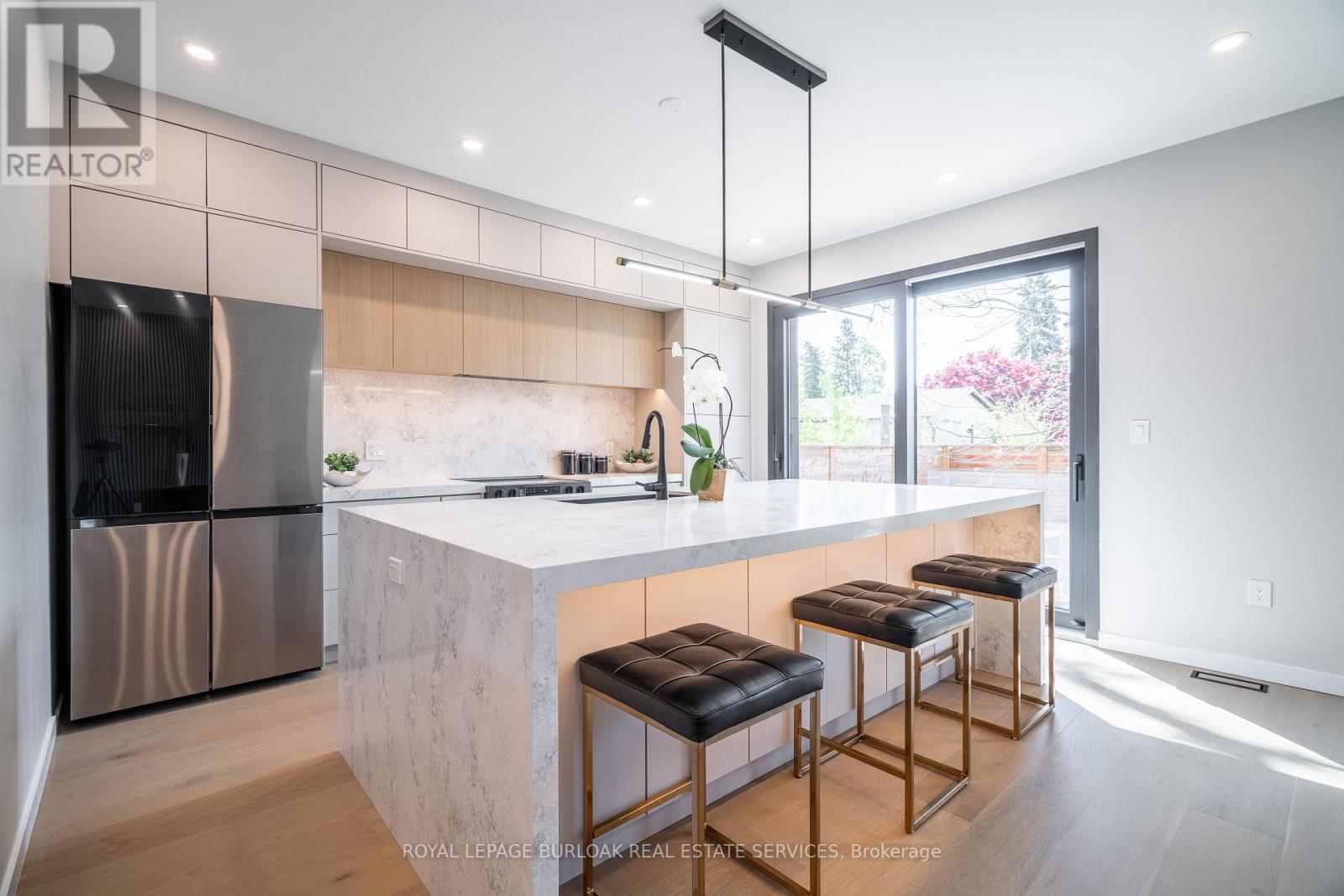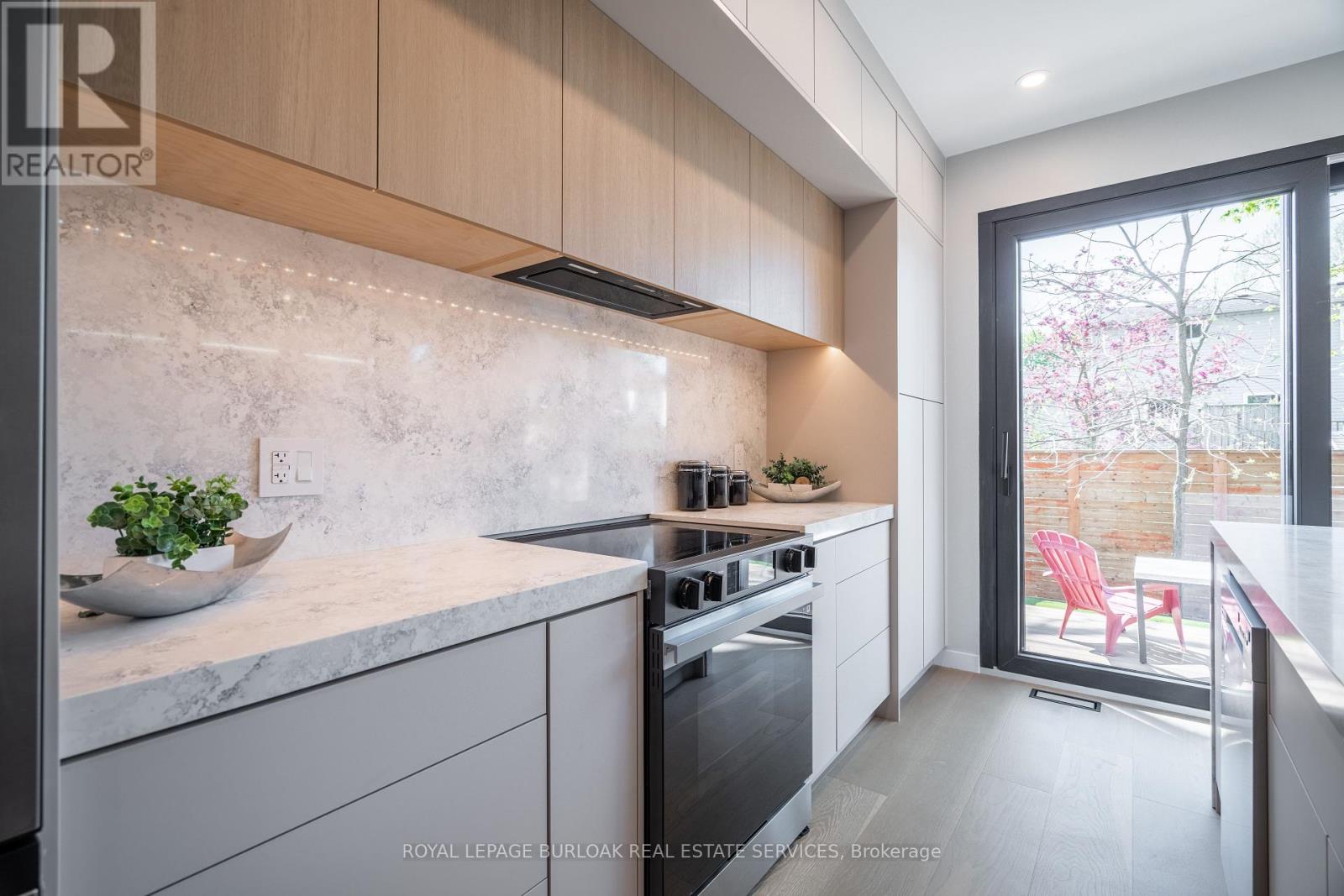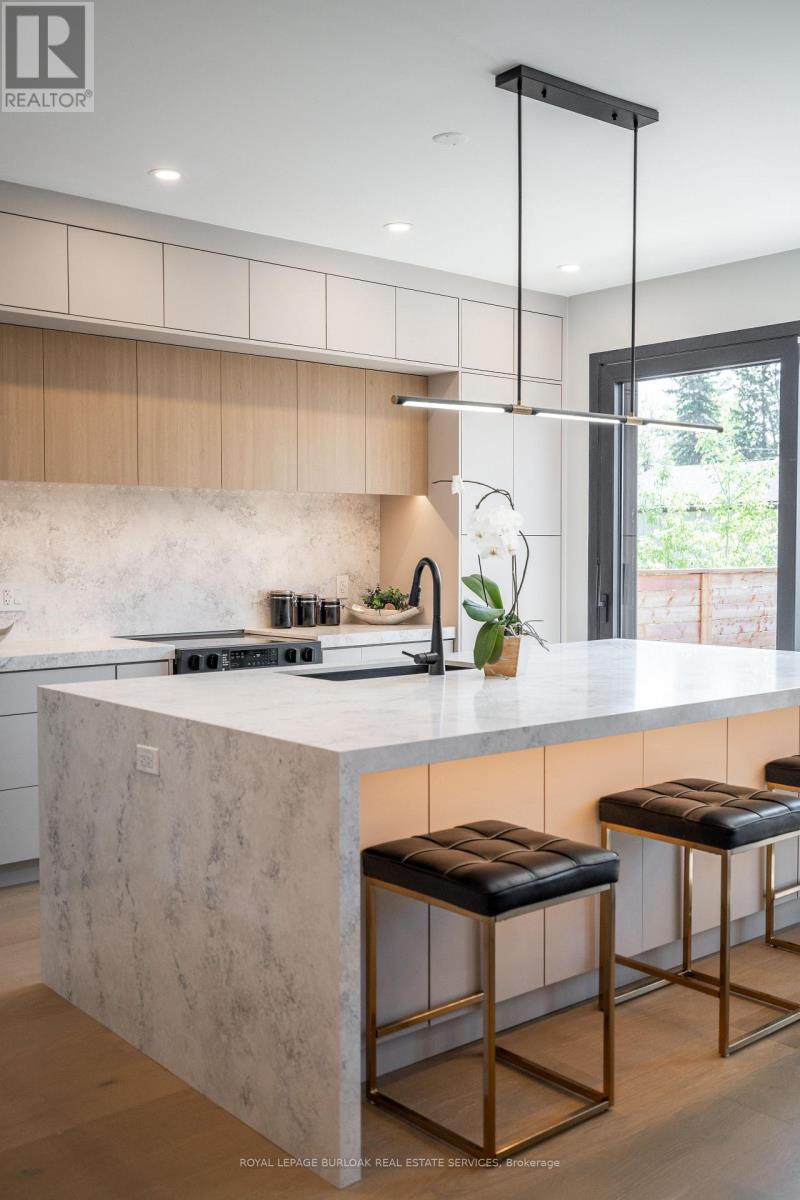 Remarkable legal duplex offering 3,535 sq. ft. of high-end living with two self-contained units! The main unit spans three levels with 4 spacious bedrooms, 3 full bathrooms plus a powder room, a chef-inspired kitchen with quartz waterfall island, custom coffee bar with beverage fridge, and a stunning third-floor retreat featuring a stunning kitchenette with Brazilian granite and two rooftop terraces. Premium finishes include 8-inch European oak hardwood floors (no carpet), European tilt-and-turn windows, frameless glass railings, solid wood doors with brass hardware, imported tile, and 9-ft smooth ceilings. The completely separate lower-level apartment is fully registered with the city, separately metered, and features a private entrance, 9-ft ceilings, full kitchen, 3-piece bath, laundry rough-ins, and superior insulation, ideal for an income-generating suite or multi-generation living. Outdoors, enjoy a zero-maintenance backyard with composite decking and pet-friendly turf. Situated close to amenities, transit, and schools, this rare offering combines luxury, versatility, and long-term value. (id:51158)