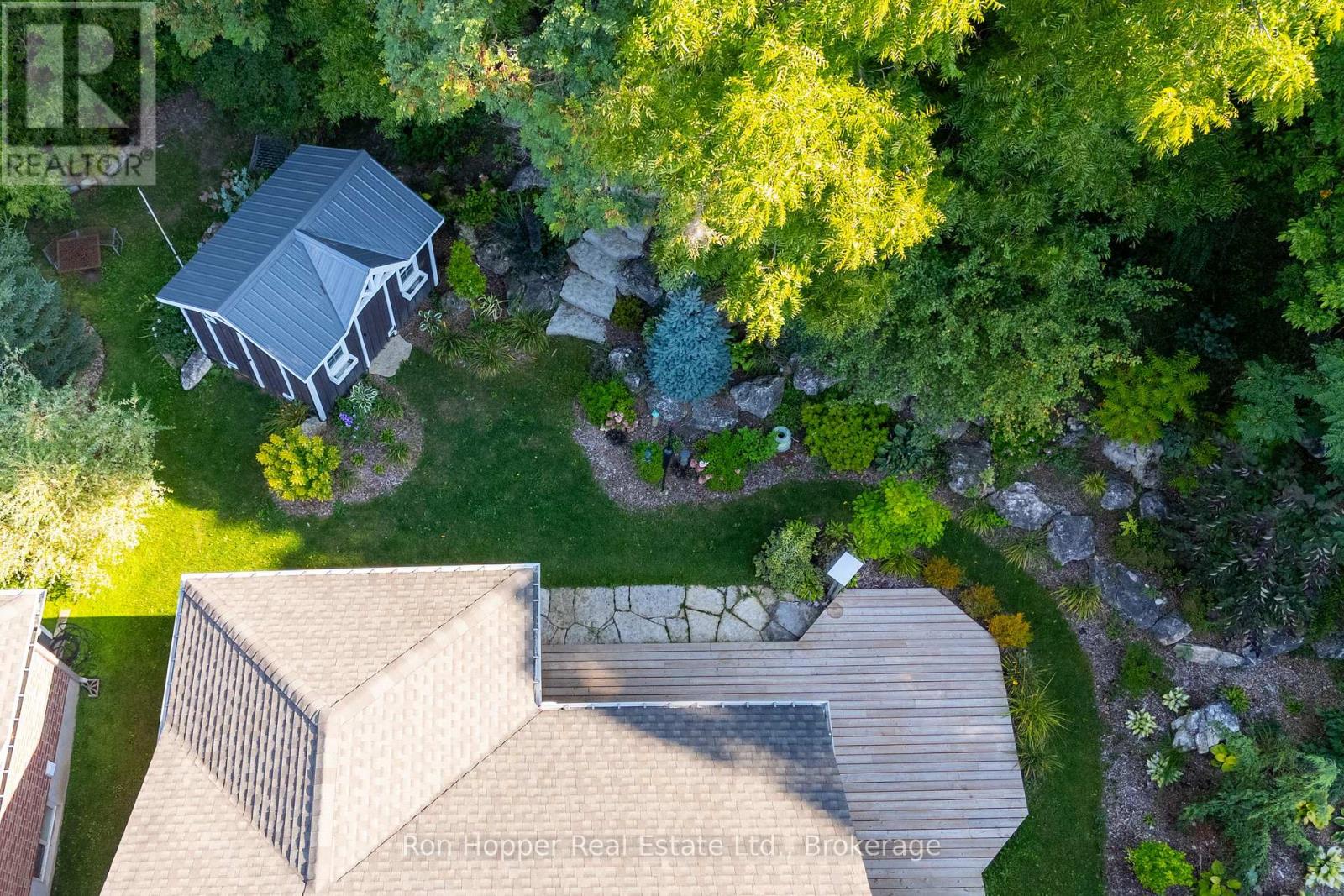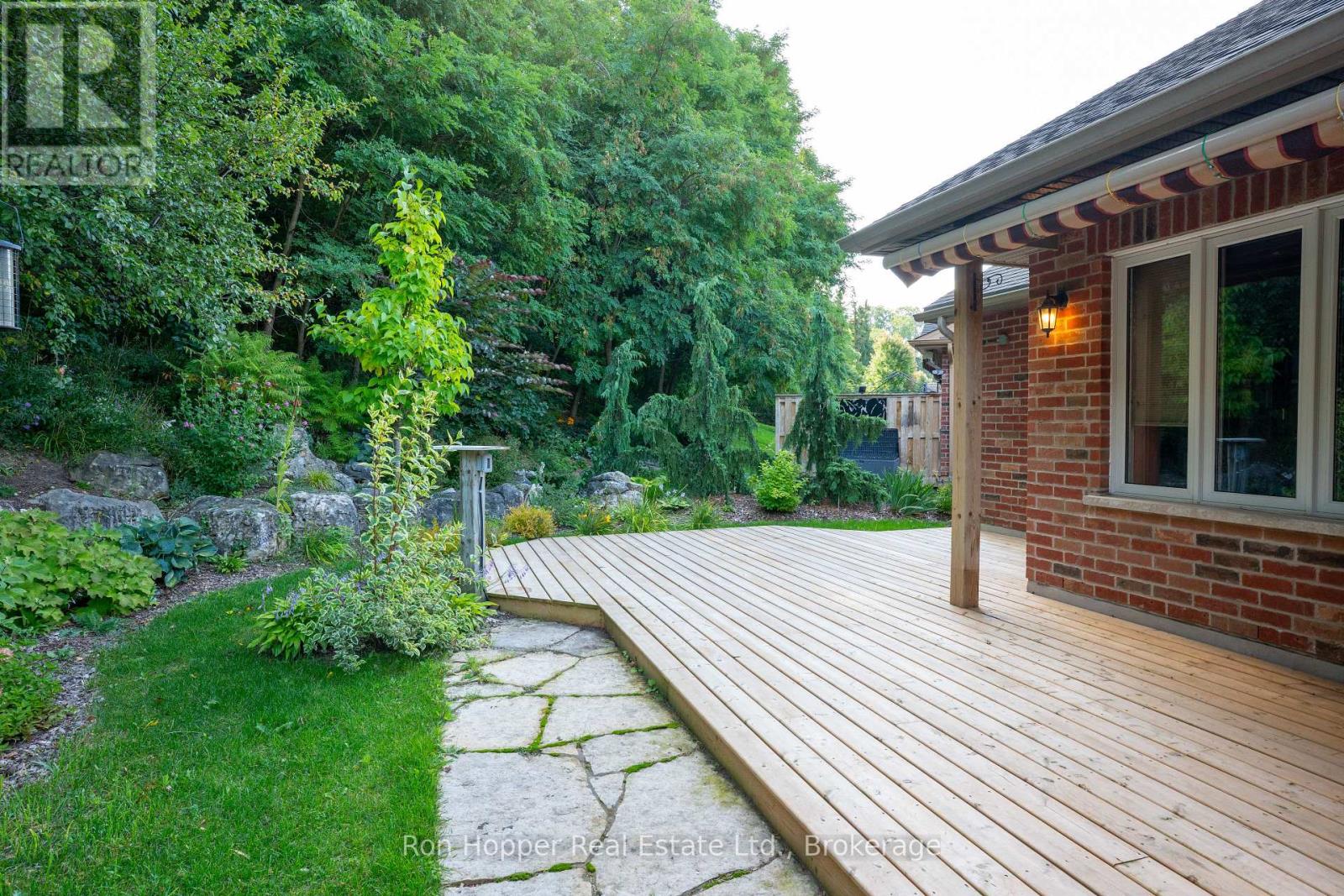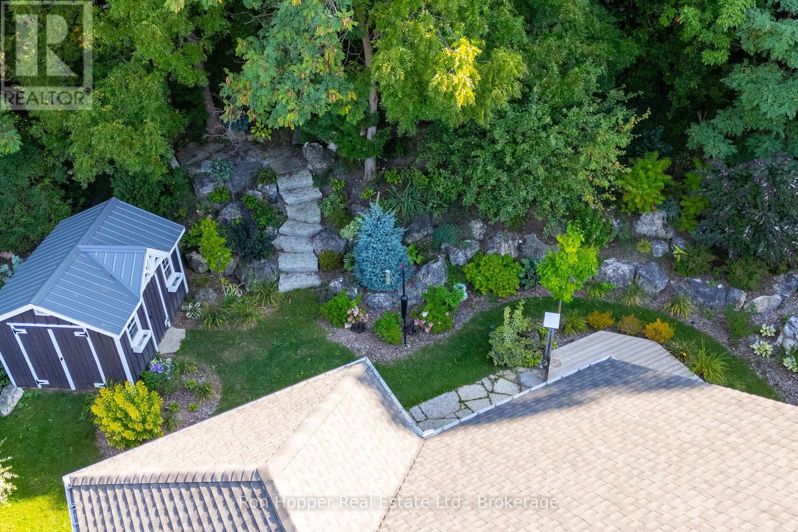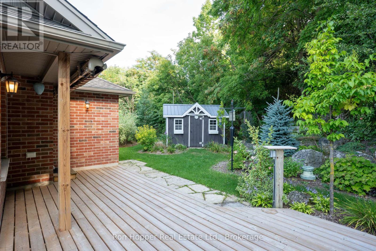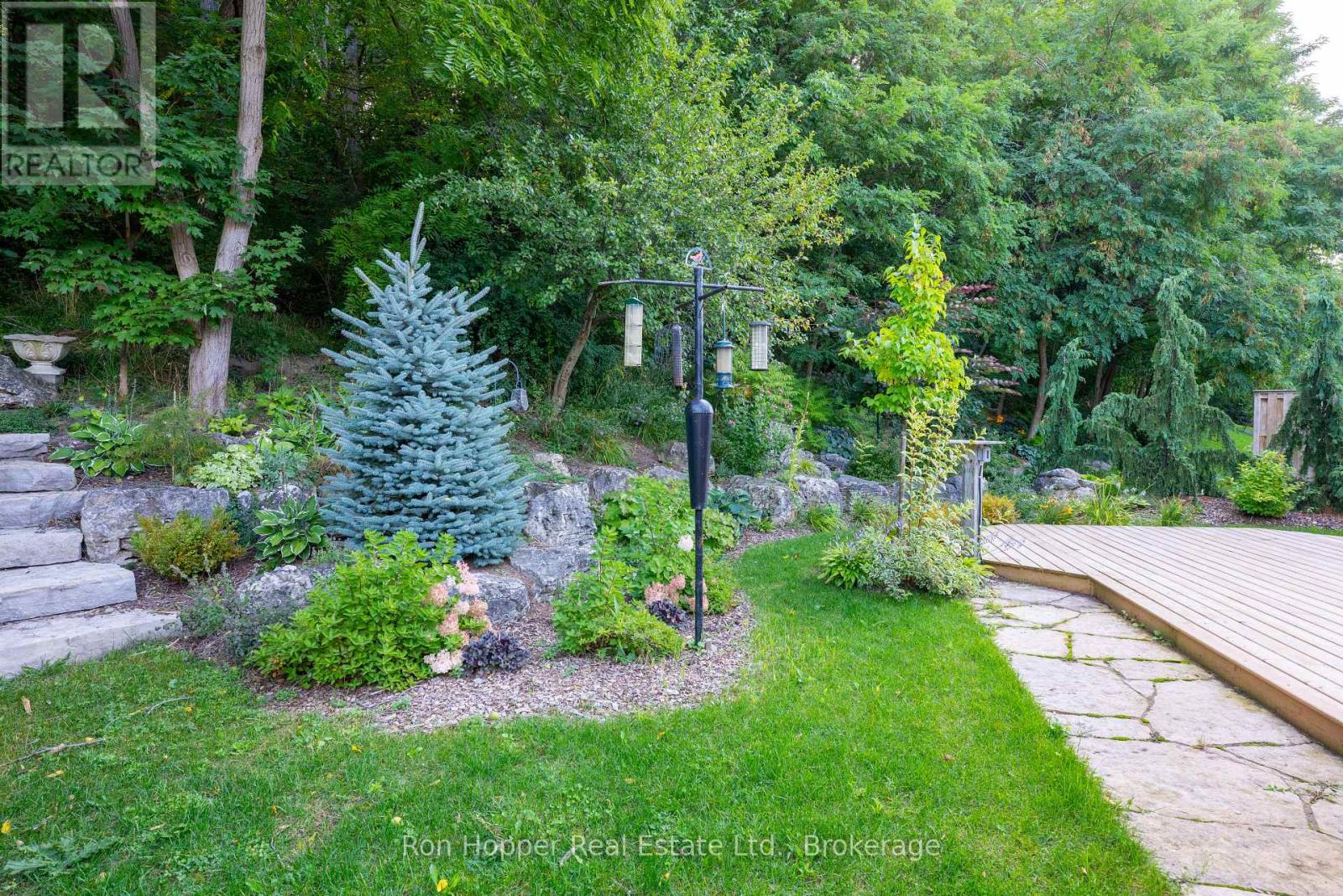 This beautiful freehold detached home backs onto the escarpment and combines an upscale living with natural outdoor beauty. This home will surprise you with over 2,000 square feet of total finished living space and its bright, modern open-concept design. The main floor features stunning hardwood floors, vaulted ceilings, pot lights, the main foyer has direct entry from the garage, complete with mezzanine with storage and a two piece bath. The heart of the home is the modern kitchen, perfect for entertaining, with stainless steel appliances, a large island, and a seamless flow into the dining and living area with walkout to the rear deck and professionally landscaped backyard. The main level also has the primary bedroom which boasts a spa-like ensuite with walk-in shower and large closet with built-ins, then there is a second good sized bedroom also with a large closet. The fully finished lower level offers expansive additional living space, with a bright family room with gas fireplace, two more bedrooms, another full bathroom, laundry, utility room and more storage space. Relax in the backyard with a private deck and awning surrounded by beautiful professionally landscaped yard and a large storage shed. Green Ridge Estates is a quiet friendly freehold community (no condo fees) with walking distance to downtown shopping, parks, the library, and is also close to the Julie McArthur Recreational Centre. Do not miss the chance to experience simple, luxury living. (id:51158)