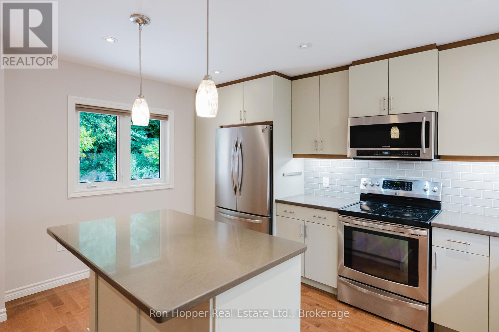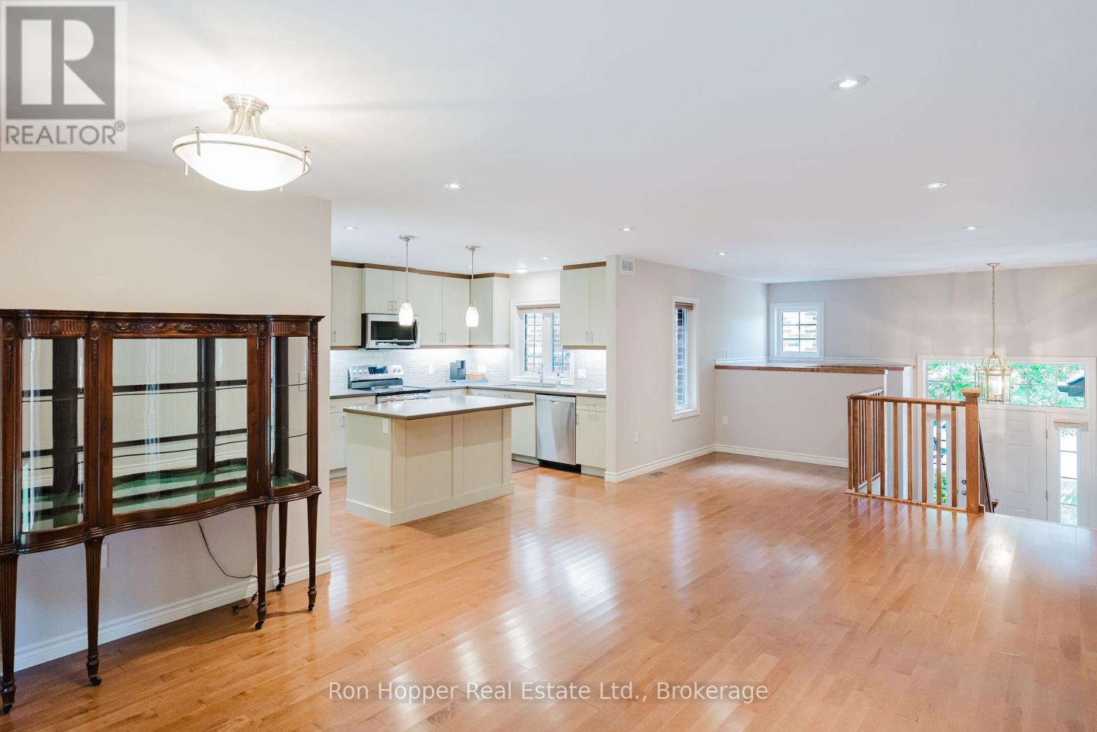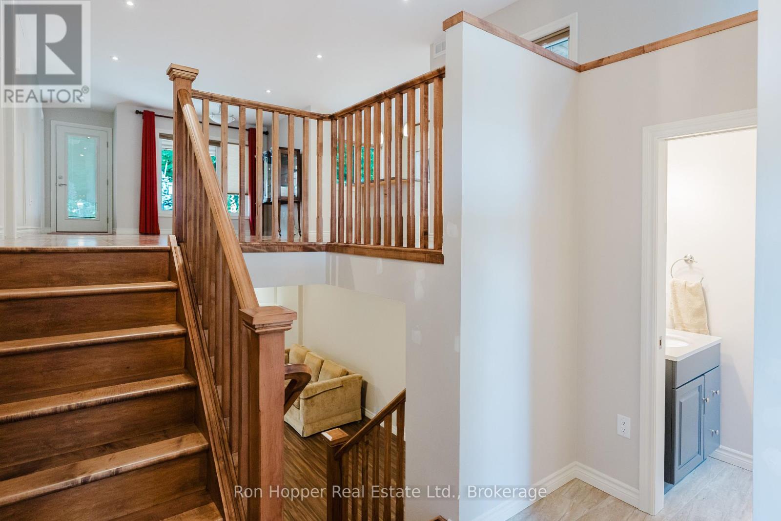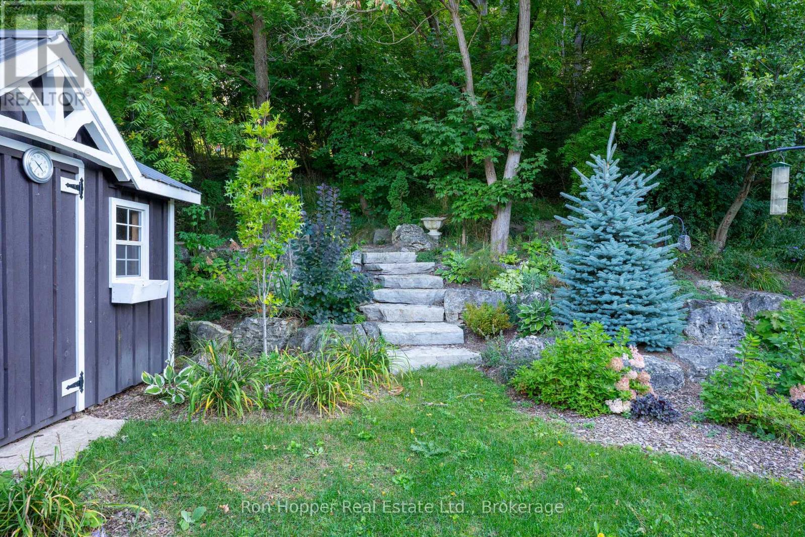 This beautiful freehold detached home backs onto the escarpment and combines an upscale living with natural outdoor beauty. This home will surprise you with over 2,000 square feet of total finished living space and its bright, modern open-concept design. The main floor features stunning hardwood floors, vaulted ceilings, pot lights, the main foyer has direct entry from the garage, complete with mezzanine with storage and a two piece bath. The heart of the home is the modern kitchen, perfect for entertaining, with stainless steel appliances, a large island, and a seamless flow into the dining and living area with walkout to the rear deck and professionally landscaped backyard. The main level also has the primary bedroom which boasts a spa-like ensuite with walk-in shower and large closet with built-ins, then there is a second good sized bedroom also with a large closet. The fully finished lower level offers expansive additional living space, with a bright family room with gas fireplace, two more bedrooms, another full bathroom, laundry, utility room and more storage space. Relax in the backyard with a private deck and awning surrounded by beautiful professionally landscaped yard and a large storage shed. Green Ridge Estates is a quiet friendly freehold community (no condo fees) with walking distance to downtown shopping, parks, the library, and is also close to the Julie McArthur Recreational Centre. Do not miss the chance to experience simple, luxury living. (id:51158)