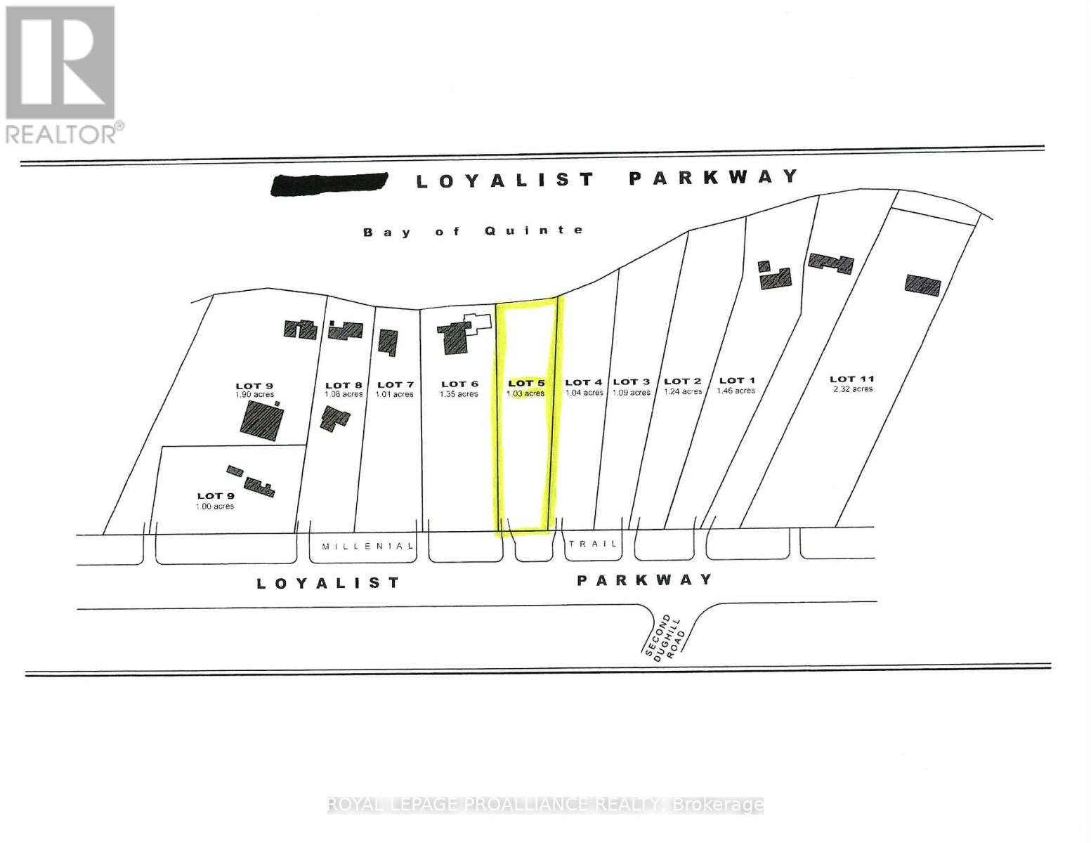 MLS: X12219605 For sale : LOT 5 39M968 22595 LOYALIST PARKWAY Your dream of owning a waterfront home on the beautiful Bay of Quinte begins here. This level 1.3 acre (+/-) parcel features approximately 116 feet of water frontage and offers an exceptional opportunity to build in a prime location on the north shore of the Bay of Quinte, near the western gateway to Prince Edward County. Enjoy close proximity to renowned wineries, breweries, art studios, fine dining, boutique shopping, beaches and 3 provincial parks. The property also offers easy access to Highway 401, hospitals and everyday conveniences.. Step outside to the Millennium Trail for hiking, walking, and endless outdoor adventures. Services include municipal water and natural gas to the lot line, along with underground hydro and communication services available in the building envelope. (id:51158)